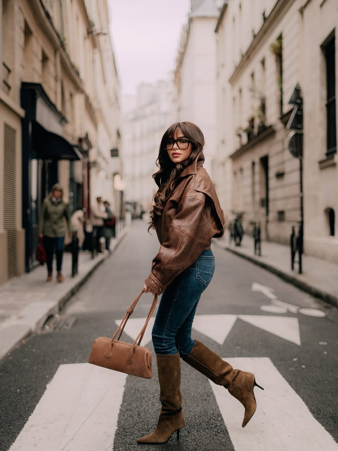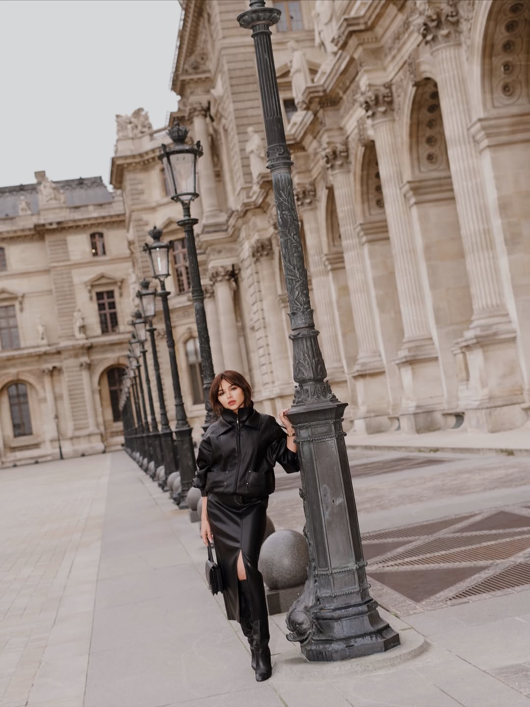 تنورة ميدي ضيقة بفتحة أمامية مع جاكيت منتفخ من الجلد الأسود، وبوت عالي وحقيبة متناغمة، مع لمسة الغرة الأمامية وخواتم مرصعة.