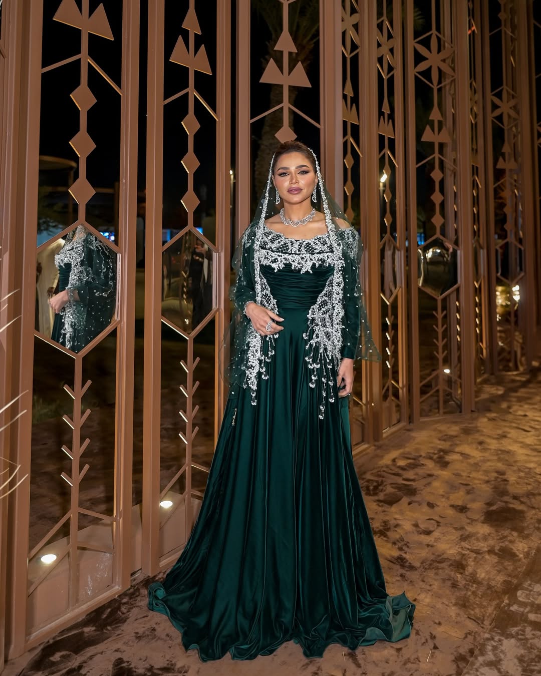 في فعاليات كأس السعودية، تألقت بفستان مخملي أخضر داكن، بقصة أوف شولدر وأكمام طويلة، مزين بتطريز شبكي من الترتر حول الياقة وأطراف الخصر، مع ذيل طويل ووشاح شفاف، ومجوهرات ماسية فخمة، لتكمل أناقتها الخليجية المعاصرة.