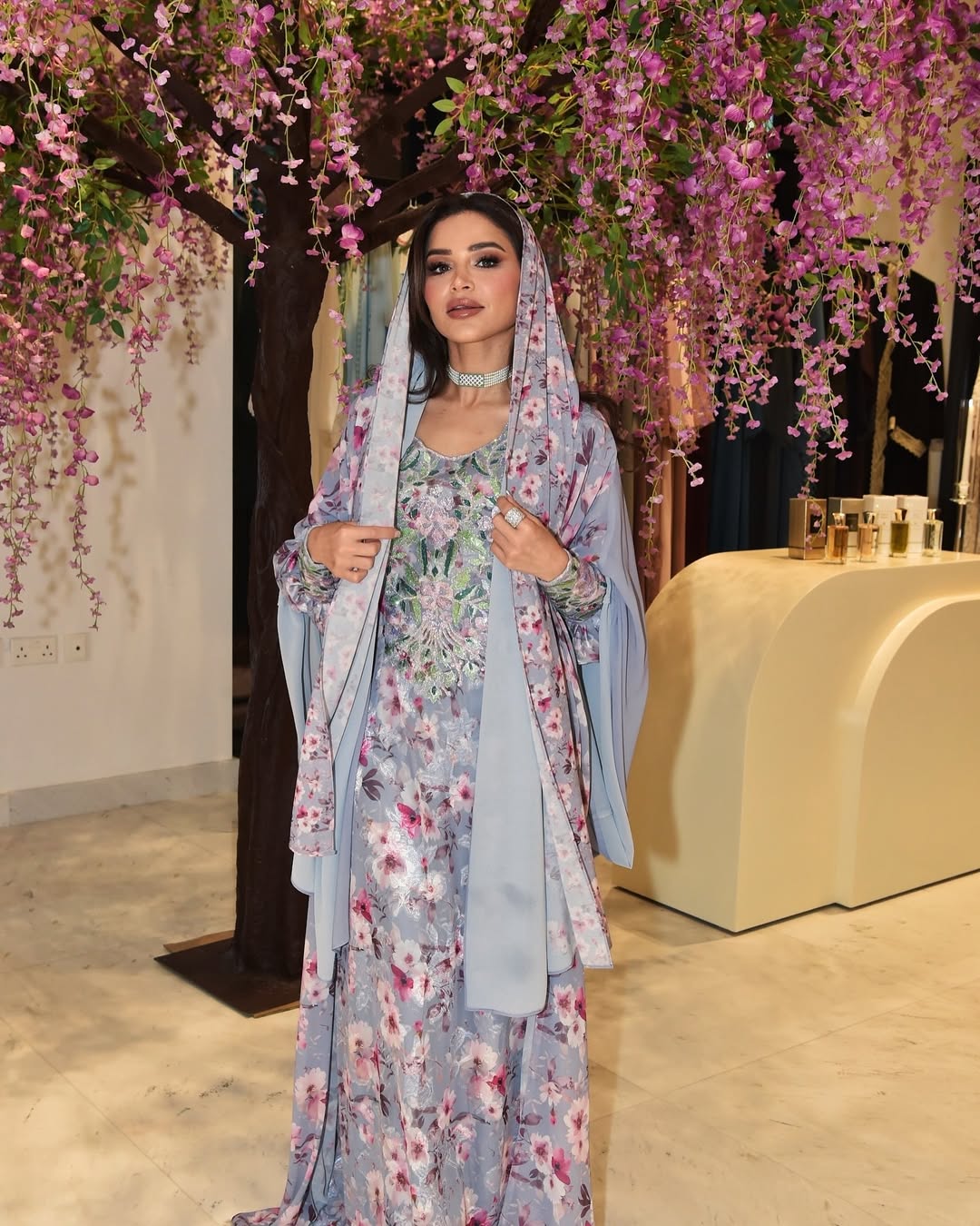 نهى طالما ظهرت بالأزياء التراثية في المناسبات الخاصة، مثل فستان إماراتي ناعم باللون البنفسجي الفاتح، مزين بالورود الزهرية وتطريز لامع على الصدر، مع كاب مرفق وغطاء للرأس، وعقد شوكر مرصع باللؤلؤ وخاتم ماس، لتجمع بين الفخامة والتراث بلمسة عصرية.