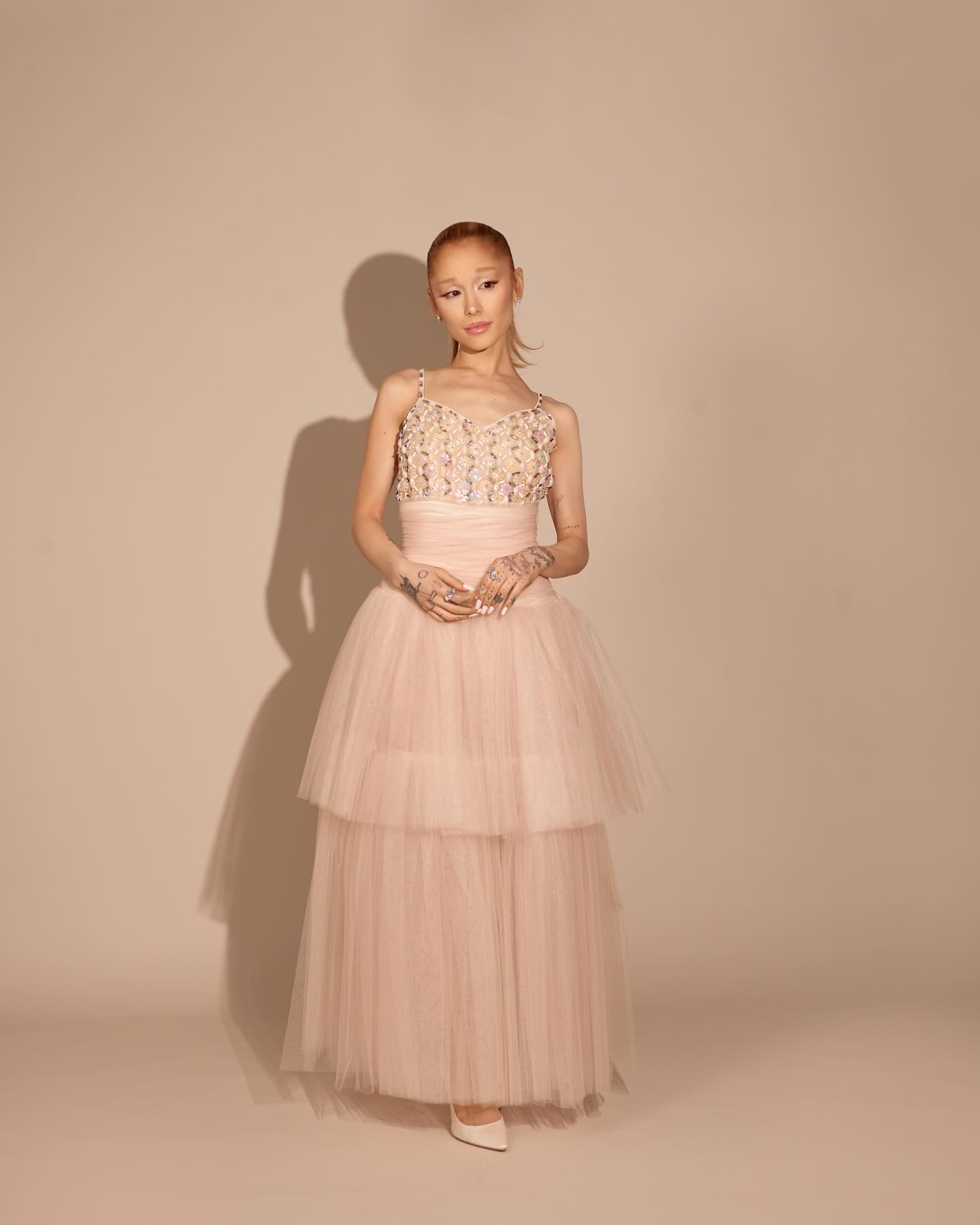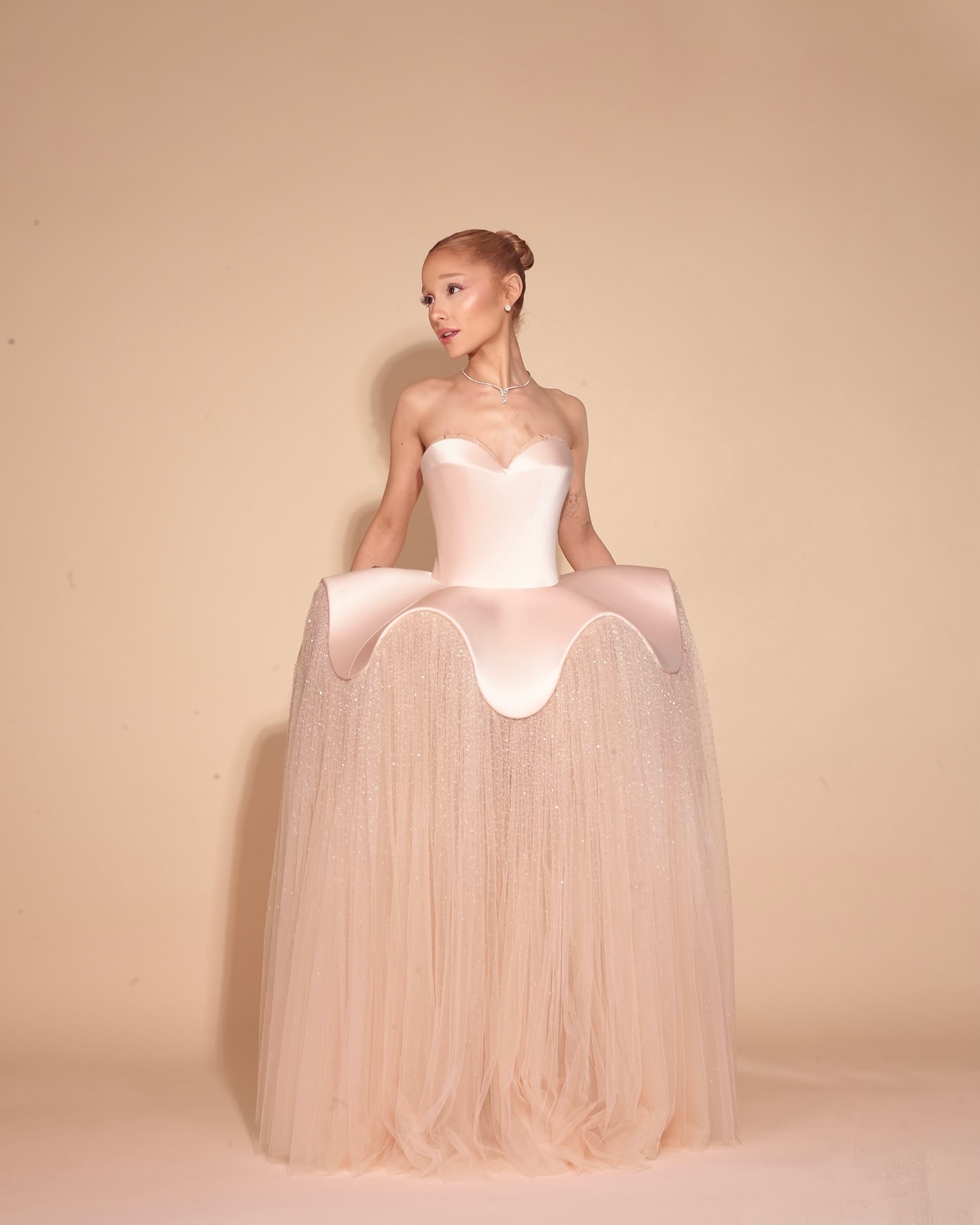 حتى مع الفخامة، حافظت أريانا على الأسلوب البسيط والناعم، مثل فستان Rodarte باللون الزهري الفاتح بطبقات الكشكش وكورسيه أوف شولدر، مع حذاء حريري وردي وقفاز قصير، أو فستان Thom Browne الكلاسيكي، المنفوش عند الأطراف مع فيونكة صغيرة عند الخصر، يمنح الإطلالة لمسة حالمة وأنيقة في آن واحد.