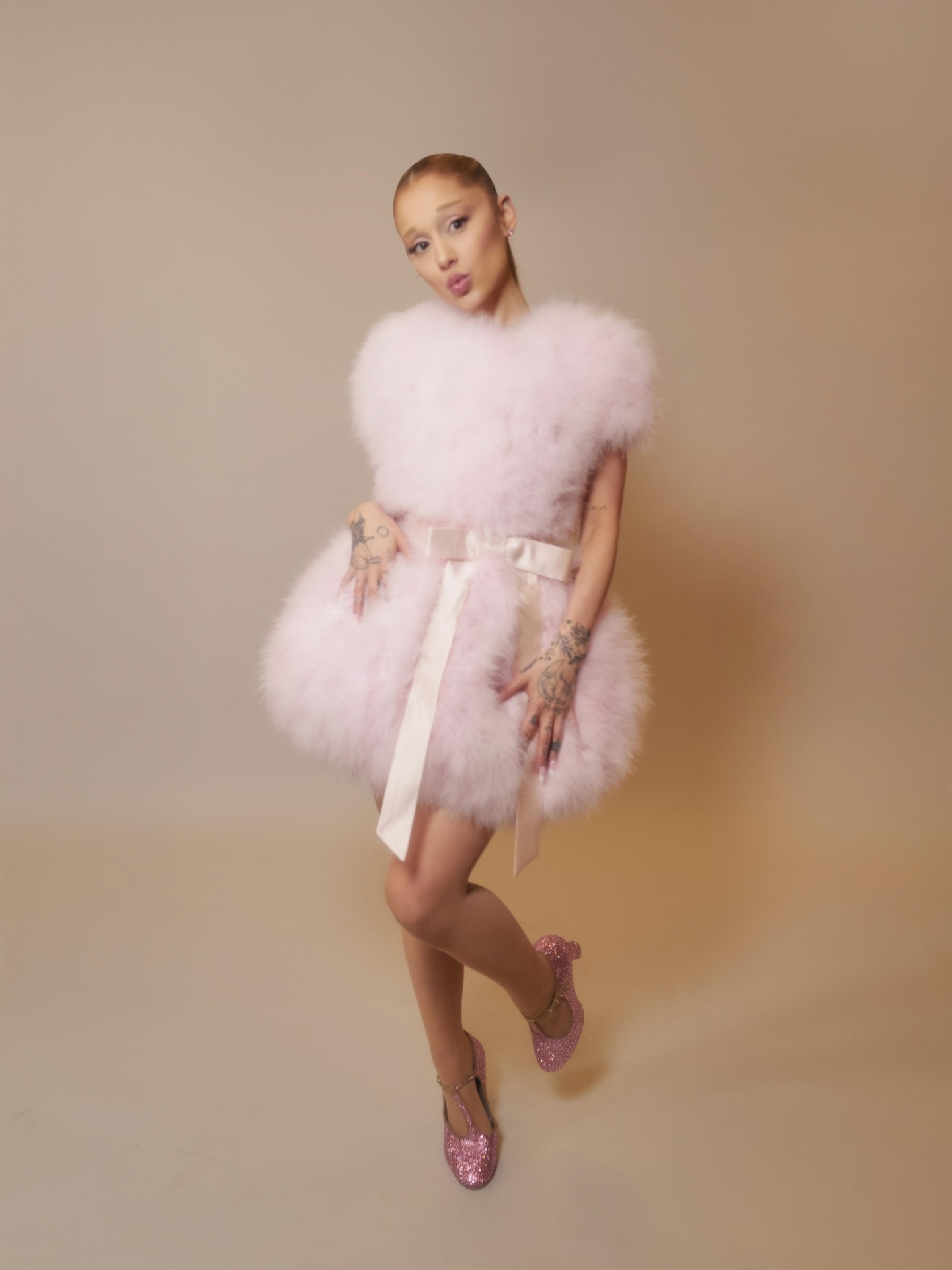 16Arlington: أطلت أريانا بفستان قصير مصنوع من الريش الناعم باللون الوردي الباستيلي، مع تنورة منتفخة تضفي حجمًا أنثويًا حول الكتفين والخصر، وشريط ساتان عريض يبرز الرشاقة. نسّقت معه حذاءً ورديًا مرصعًا بالكريستال ذي كعب عالٍ، ليكتمل اللوك الساحر.