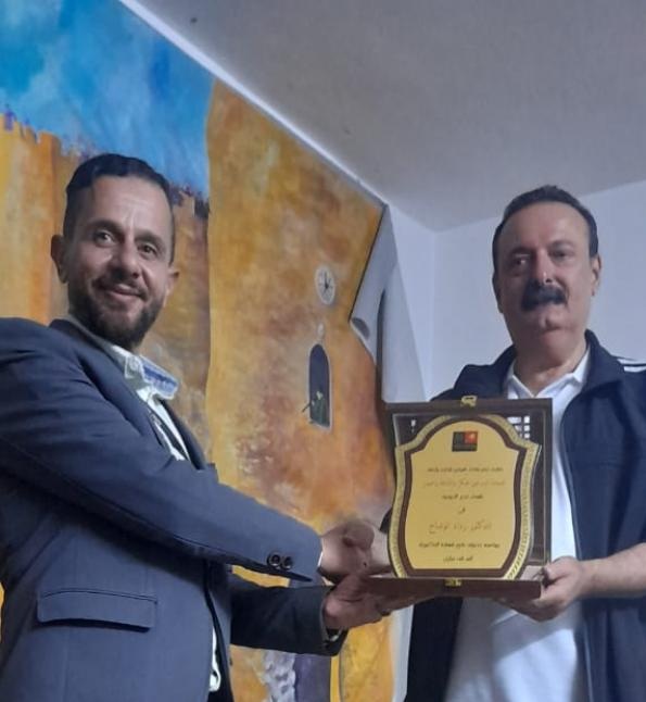 اختُتم الحفل بتقديم درع جمعية المبدعين للفكر والثقافة والفنون من قبل رئيسها الاستاذ جلال ابو طالب تكريما له