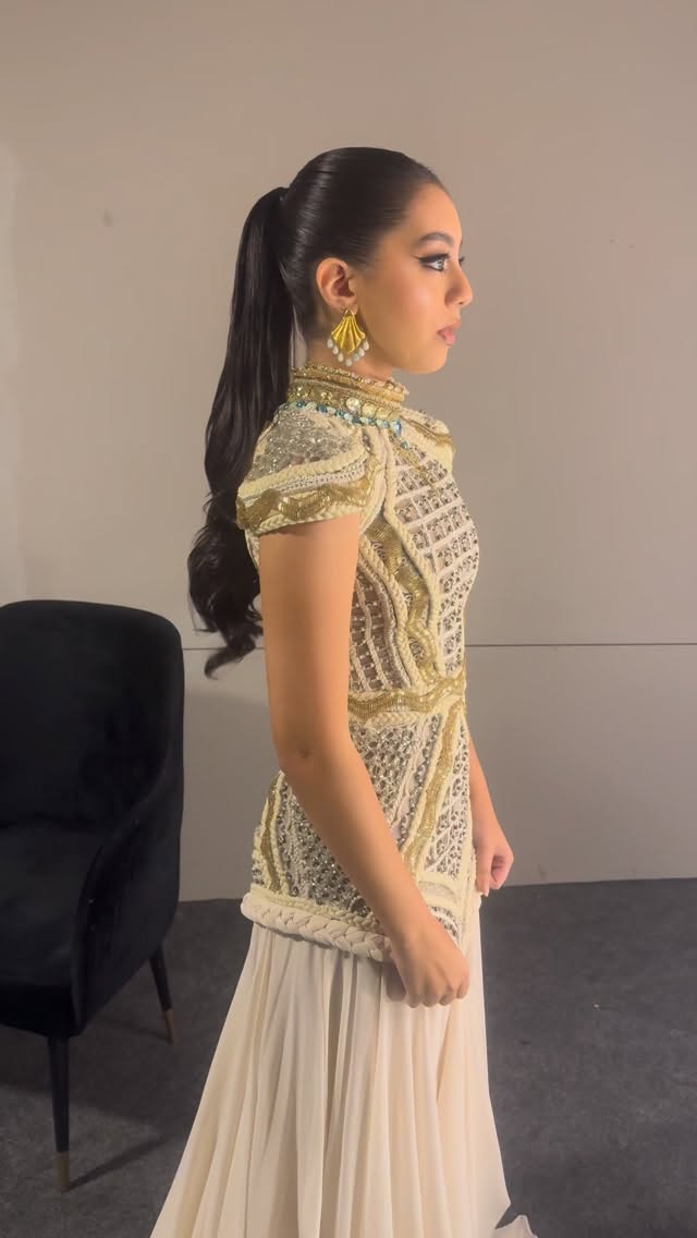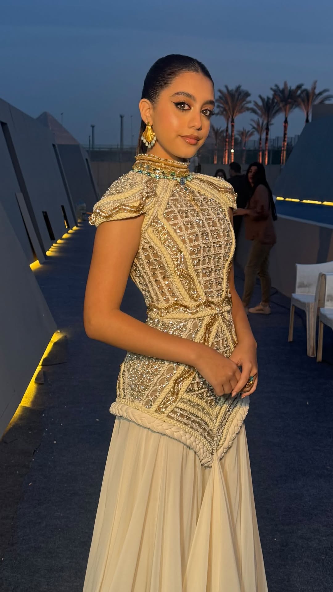 في افتتاح المتحف المصري الكبير، أطلت ياسمينا بفستان طويل باللون الأوف وايت، مزين بياقة عالية وأكتاف عريضة، مع كورسيه مطرز شبيه بالدرع يحدد الخصر ويبرز القوة والأنوثة معًا. تداخلت التطريزات الفضية والذهبية مع ضفائر وأحجار لامعة بأسلوب مستوحى من الزي الفرعوني، بينما أكمَلَت الإطلالة أقراط ذهبية وتسريحة ذيل الحصان العالي، لتبدو في غاية الرقي والفخامة.