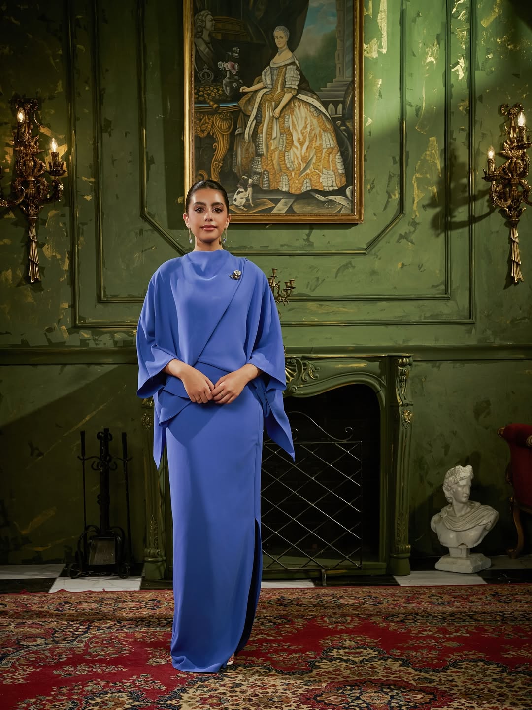 في دار الأوبرا بالعاصمة الجديدة، اختارت ياسمينا فستانًا أزرق طويلًا انسيابيًا، مزودًا بكاب علوي على شكل طبقات أنيقة، مع بروش مرصع وأقراط طويلة، مظهرة أسلوبًا يجمع بين التوقير والعصرية، مع الحفاظ على لمسة الفخامة.