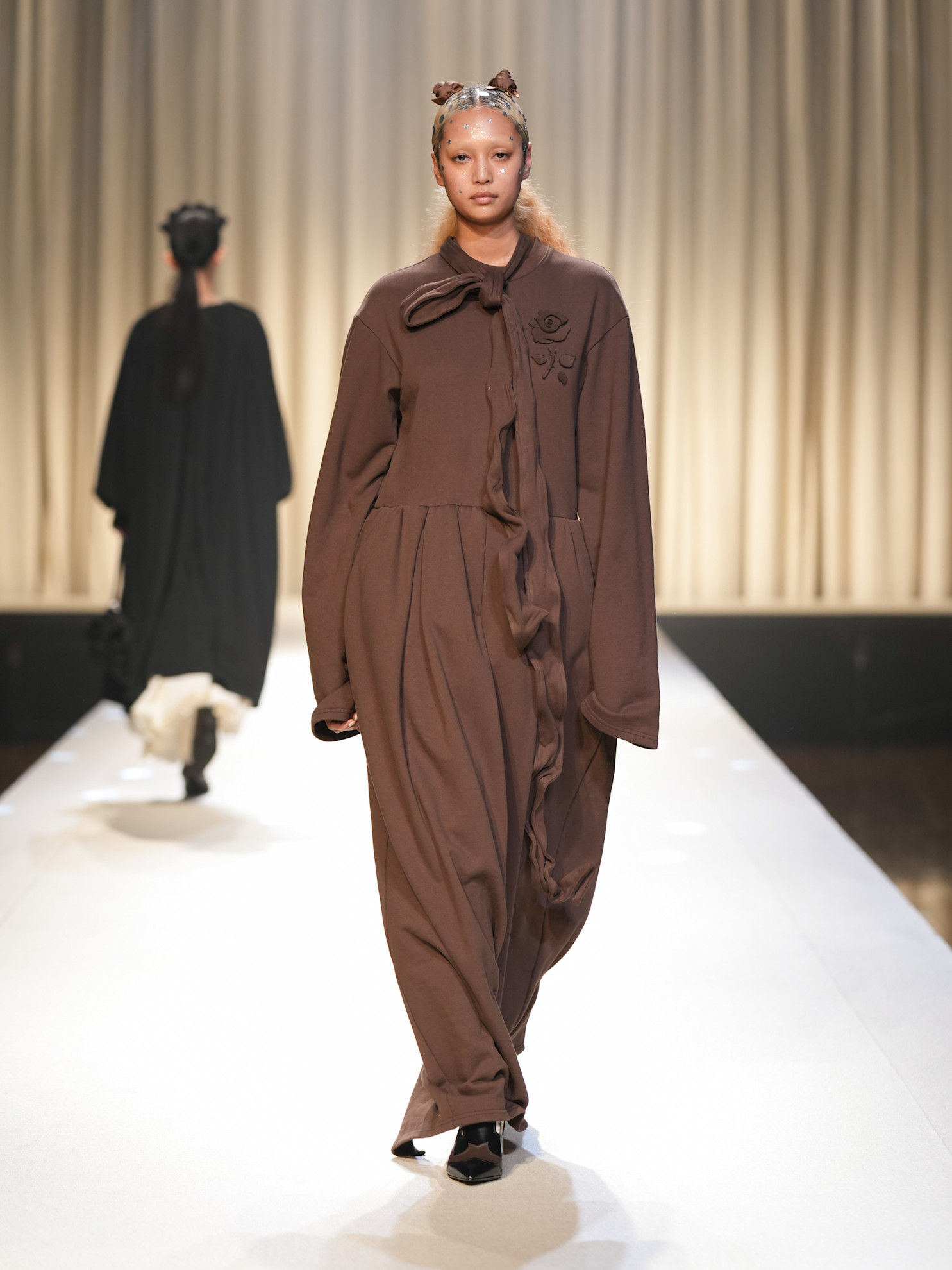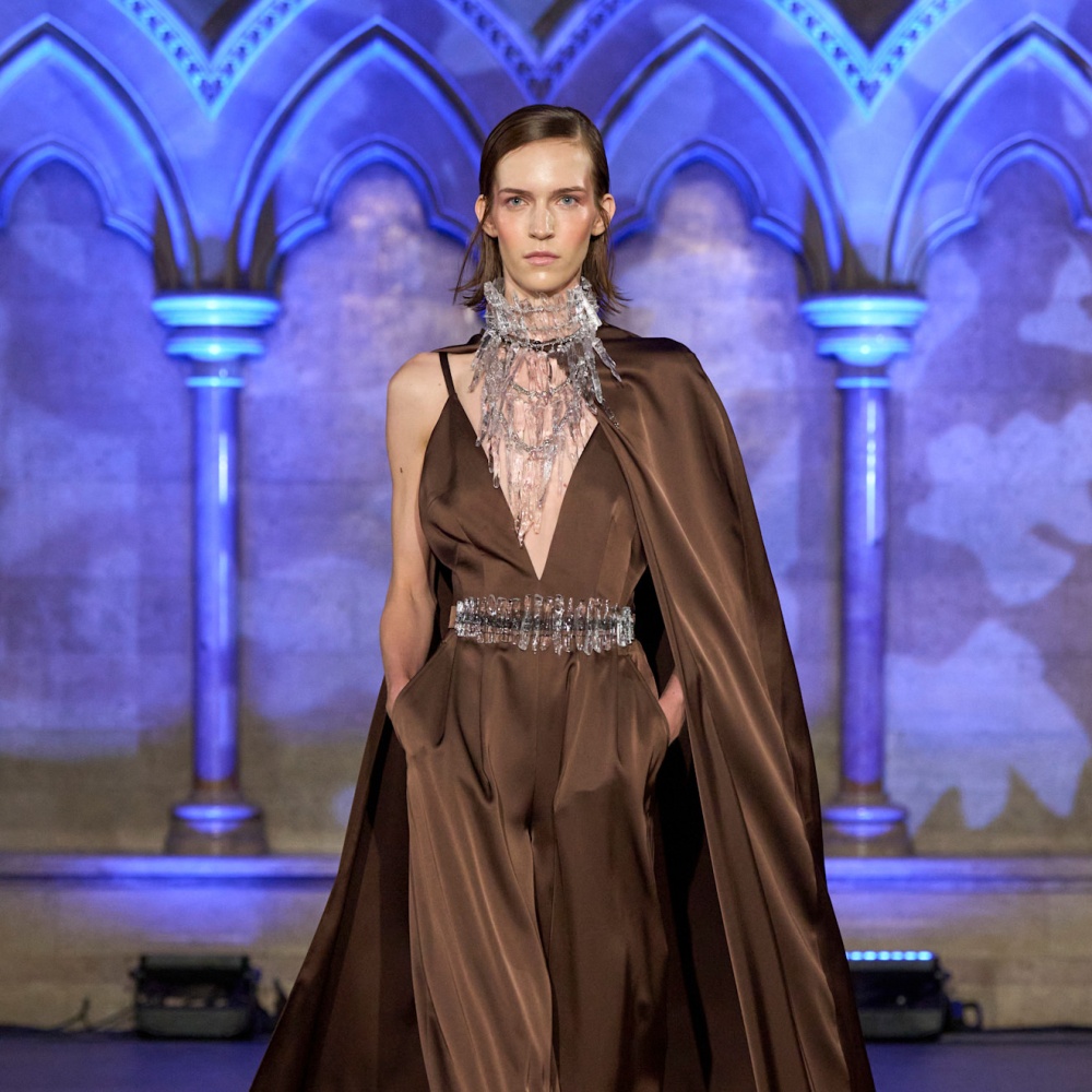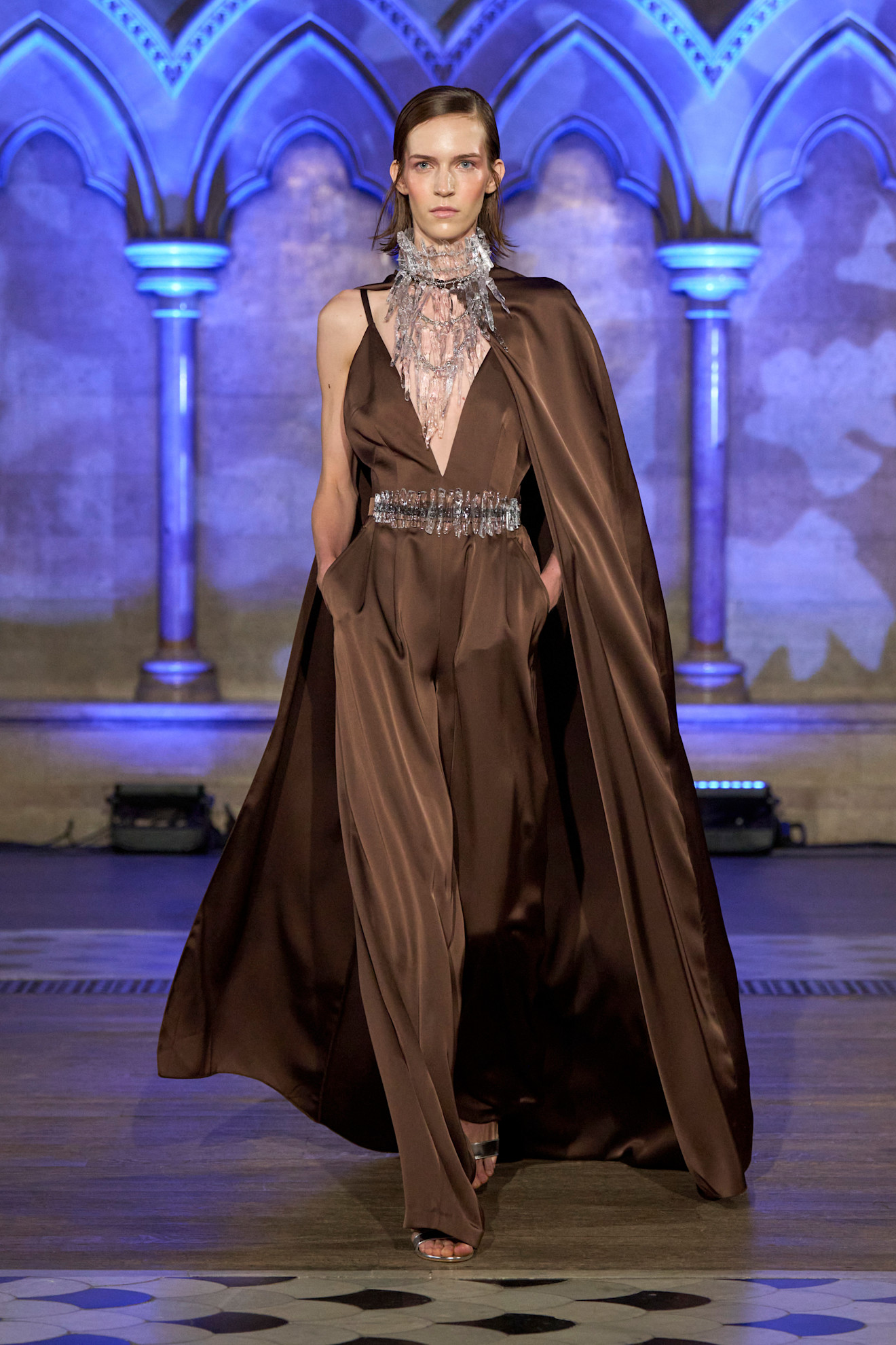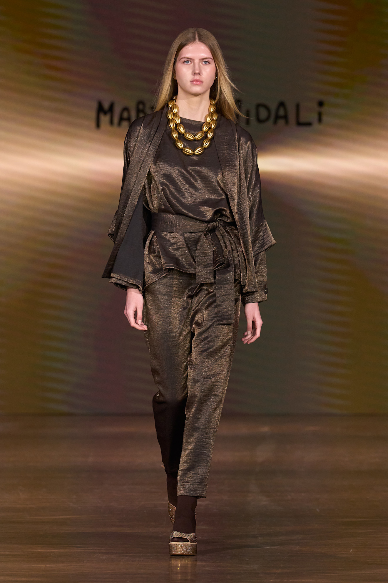 من دار Martino Midali برزت تصاميم الجمبسوت ذات الخصر المزموم بخيوط بارزة وعصرية، المصنوعة من أقمشة الكريب اللامعة، والتي تمتد حتى الكاحل لتمنح القوام طولًا وأناقة. هذه القصة الضيقة والمحددة تليق بإطلالات الشتاء الأنيقة، خصوصًا مع الأحذية الجلدية العالية والمعاطف الطويلة.