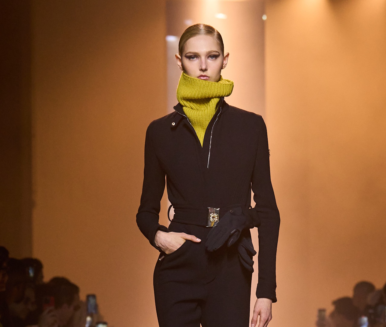 الدار الفرنسية Louis Vuitton أعادت تقديم الجمبسوت الصوفي بأسلوب شبابي متقن، يجمع بين القماش الضيق والخطوط المضلعة، مع كاب طويل ينسدل من الكتفين لمزيد من الفخامة. التصميم يتميز بياقة عالية وأكتاف جامدة تمنح حضورًا قويًا، فيما تضيف الأرجل الضيقة لمسة أنوثة متوازنة.
