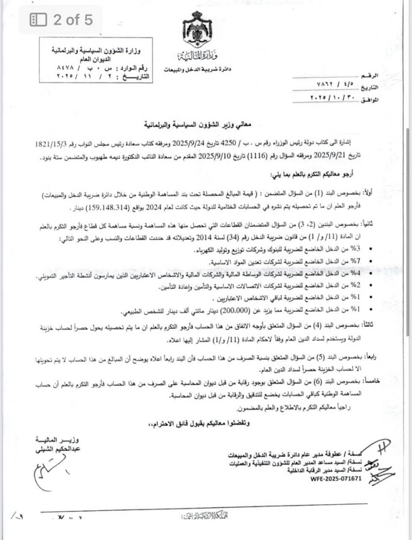للعلّم - كشف رد الحكومة على سؤال نيابي وجهته النائب الدكتورة ديمة طهبوب، عن حجم المبالغ التي تم تحصيلها تحت بند "المساهمة الوطنية" للعام المالي 2024، والقطاعات المشمولة وغير المشمولة بهذه المساهمة، إضافة إلى آلية صرفها وتحويلها إلى الخزينة العامة.