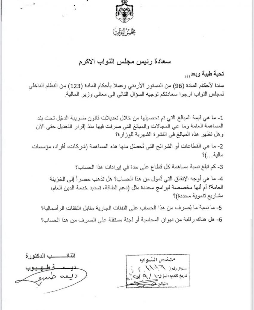 وأوضجت إجابة الحكومة على سؤال طهبوب، أن الأموال المتحصلة تُحوَّل إلى الخزينة العامة للدولة وفقاً لأحكام المادة (11/أ) من القانون، وتخصص لسداد الدين العام، فيما تخضع عمليات التحصيل والصرف لرقابة ديوان المحاسبة وهيئة النزاهة لضمان الشفافية وحسن إدارة المال العام.