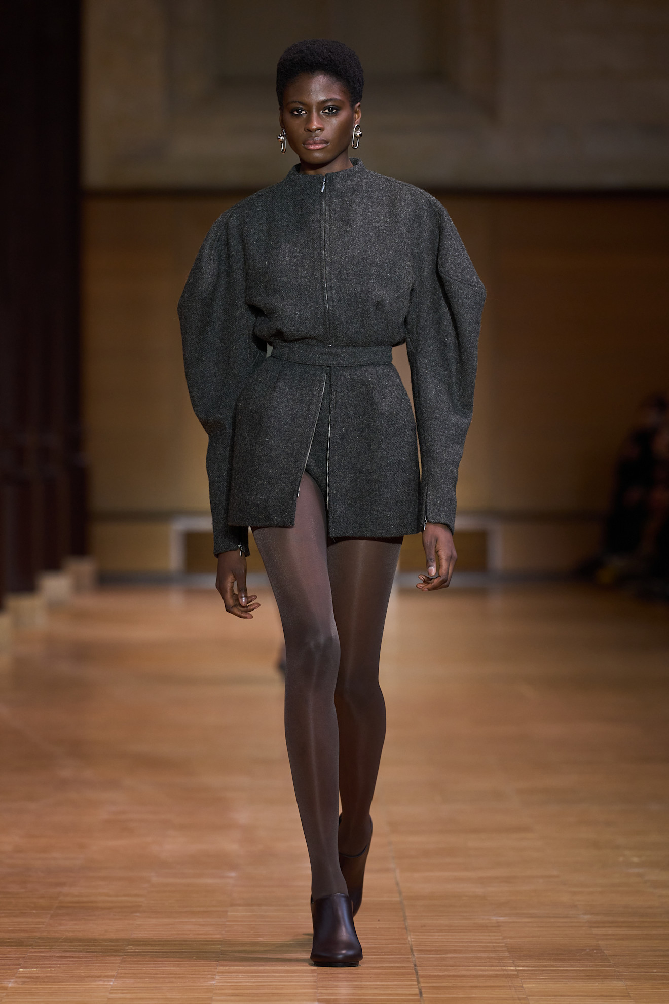 مثال: جاكيت متوسط الطول بالرمادي مع جوارب وحذاء بني.