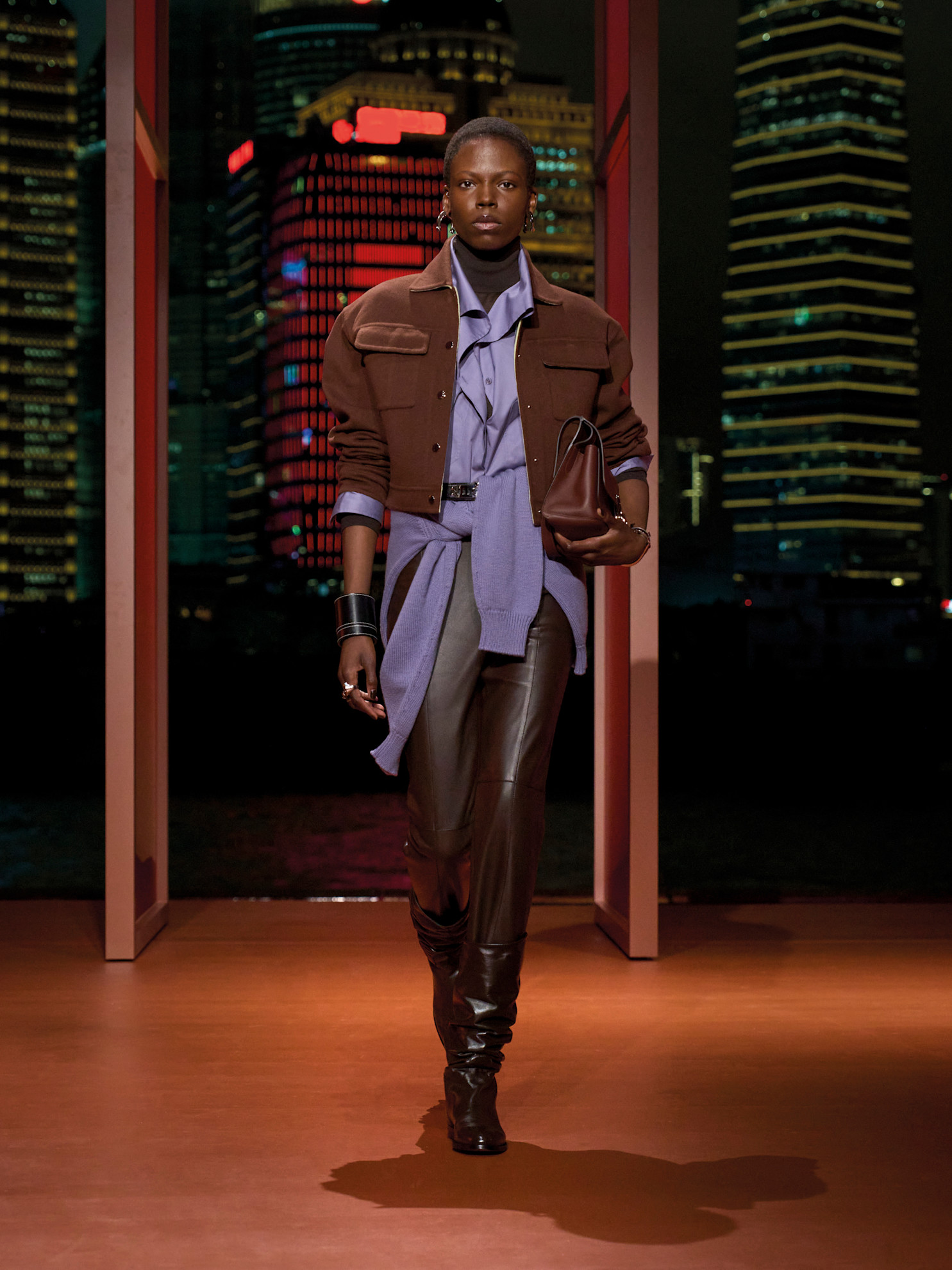 مثال: البني الترابي مع البنفسجي الفاتح على طريقة Hermes، يمنح الإطلالة شباباً وأنوثة.