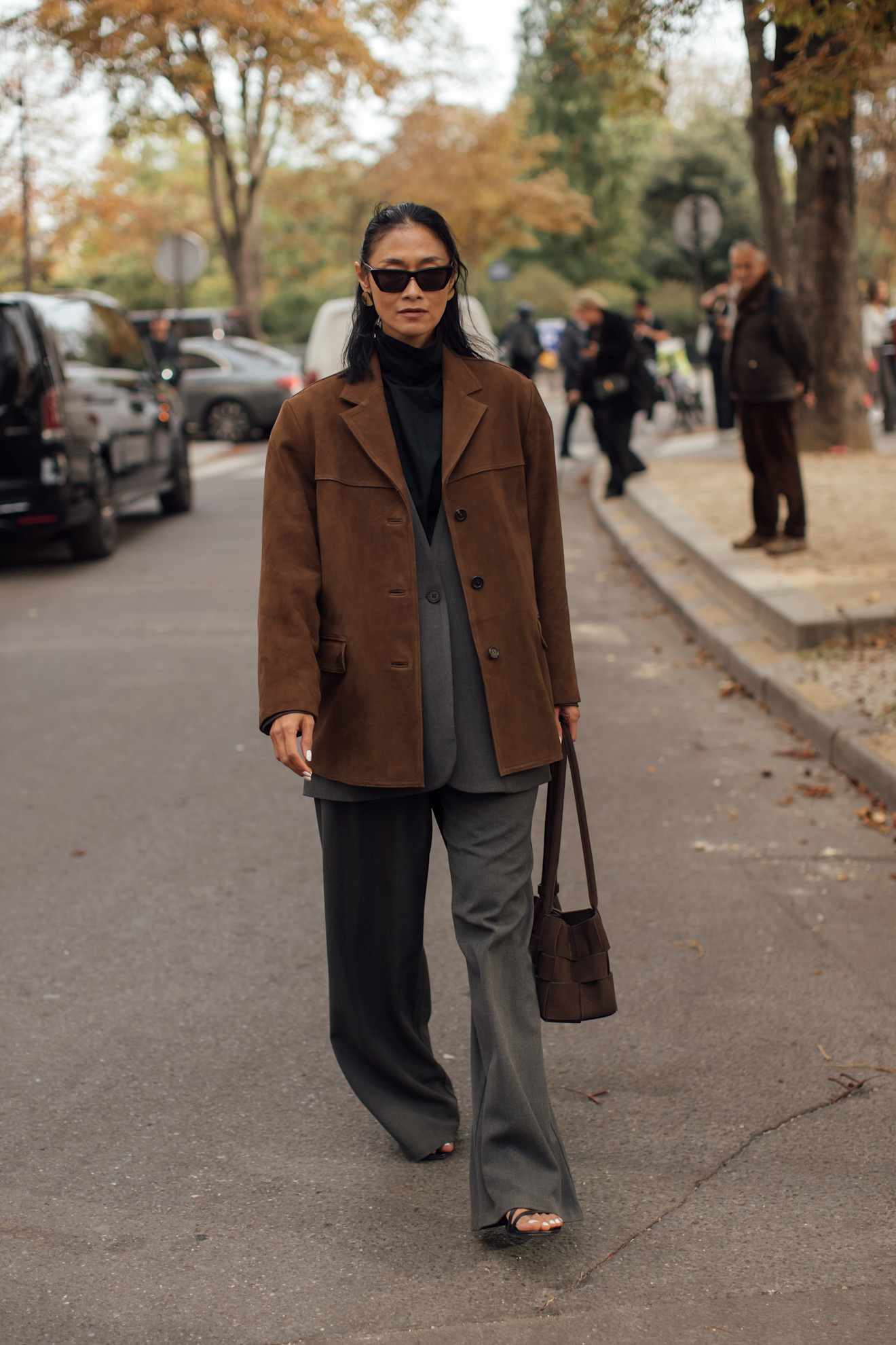 اعتمدي البني بالكامل مع اللعب بتدرجاته بين الفاتح والداكن، واستخدمي خامات وأنسجة مختلفة لكسر رتابة الإطلالة.