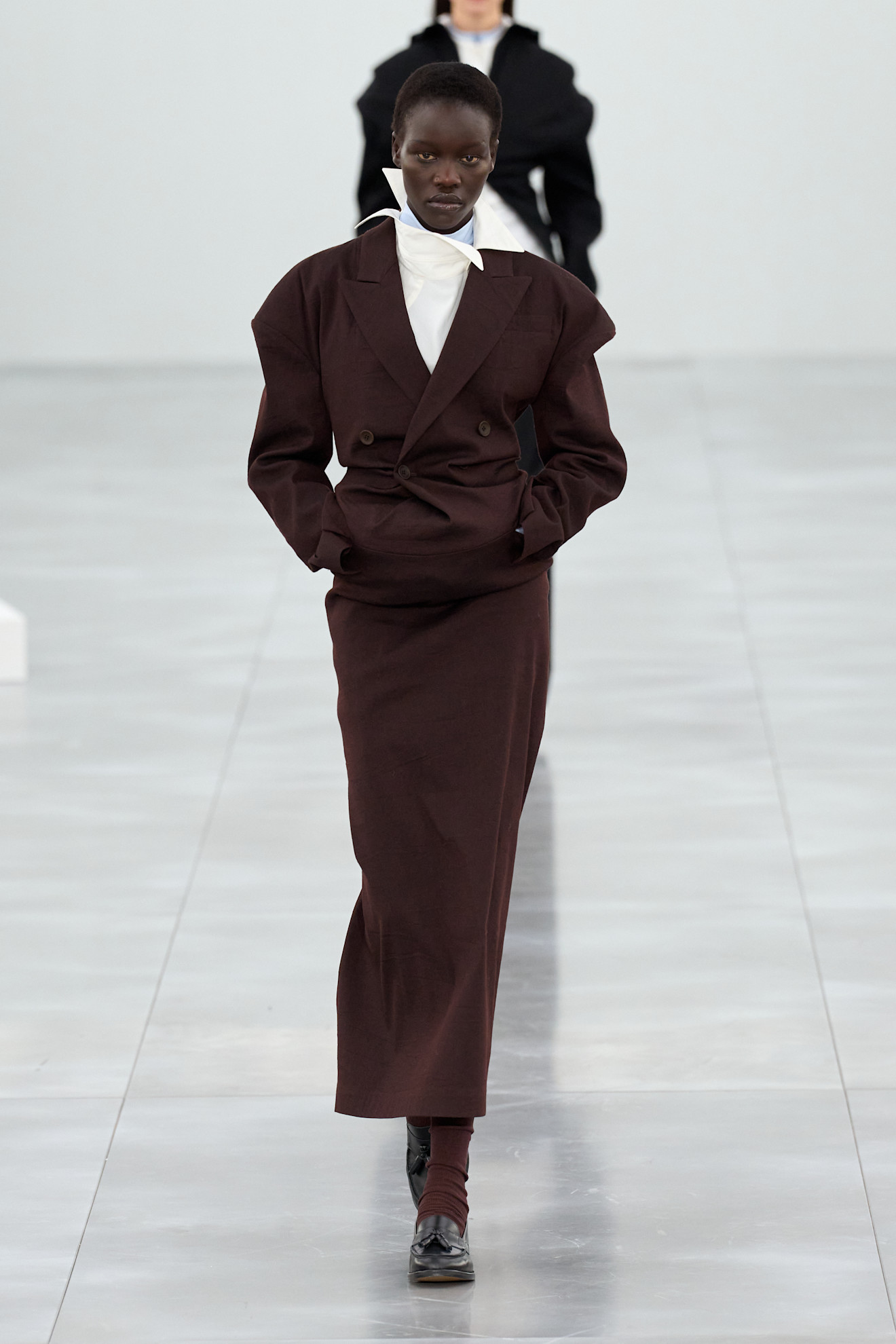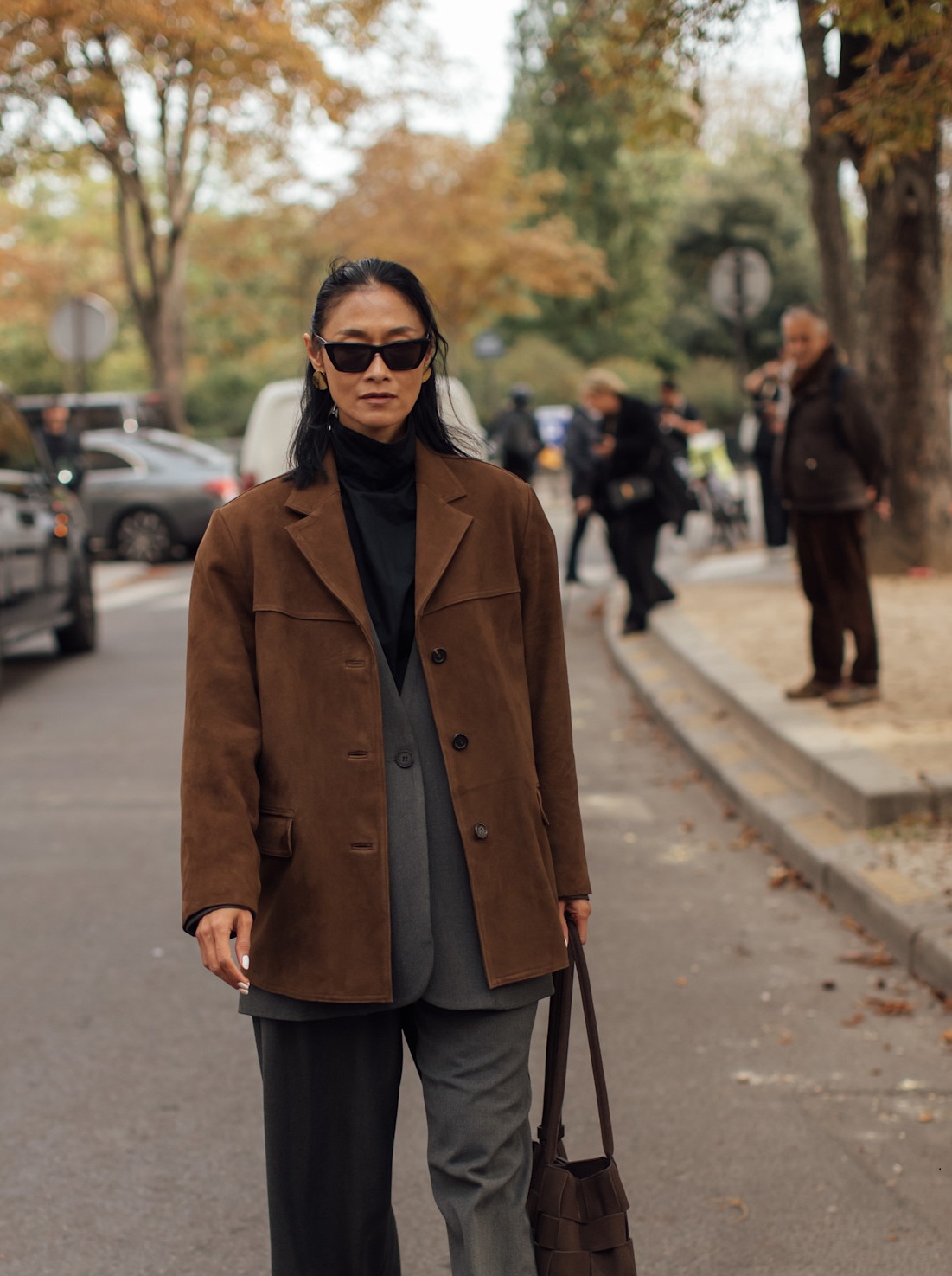 مثال: بدلة بني داكن مع قميص أبيض، لإطلالة دافئة وأنيقة على طريقة Miyake.
