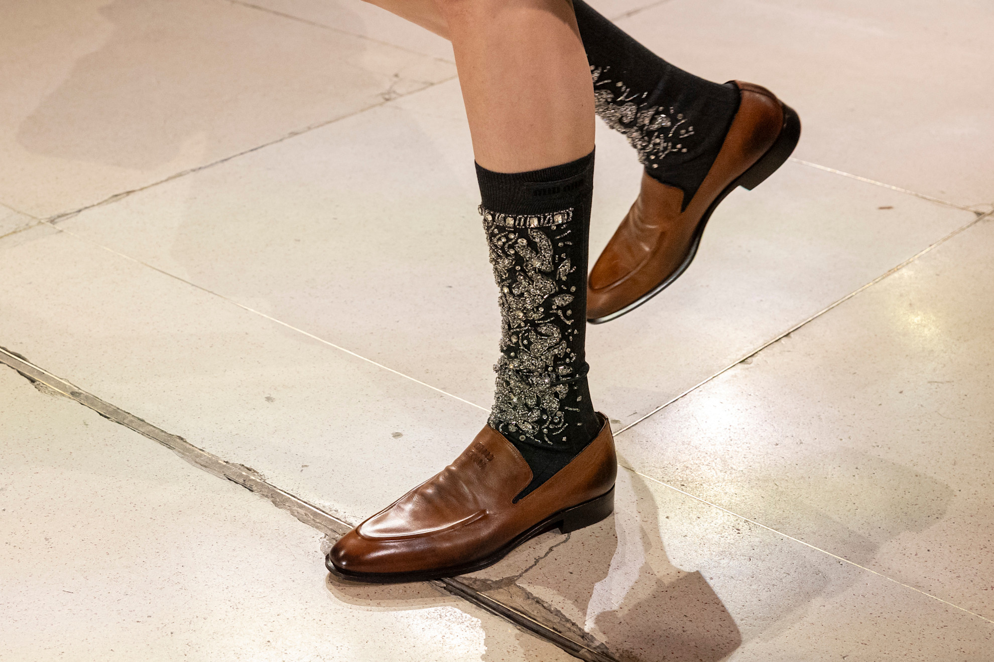 مثال: حذاء من Duran Lantink بنقوش فاخرة، يضيف لمسة رقي كلاسيكية.