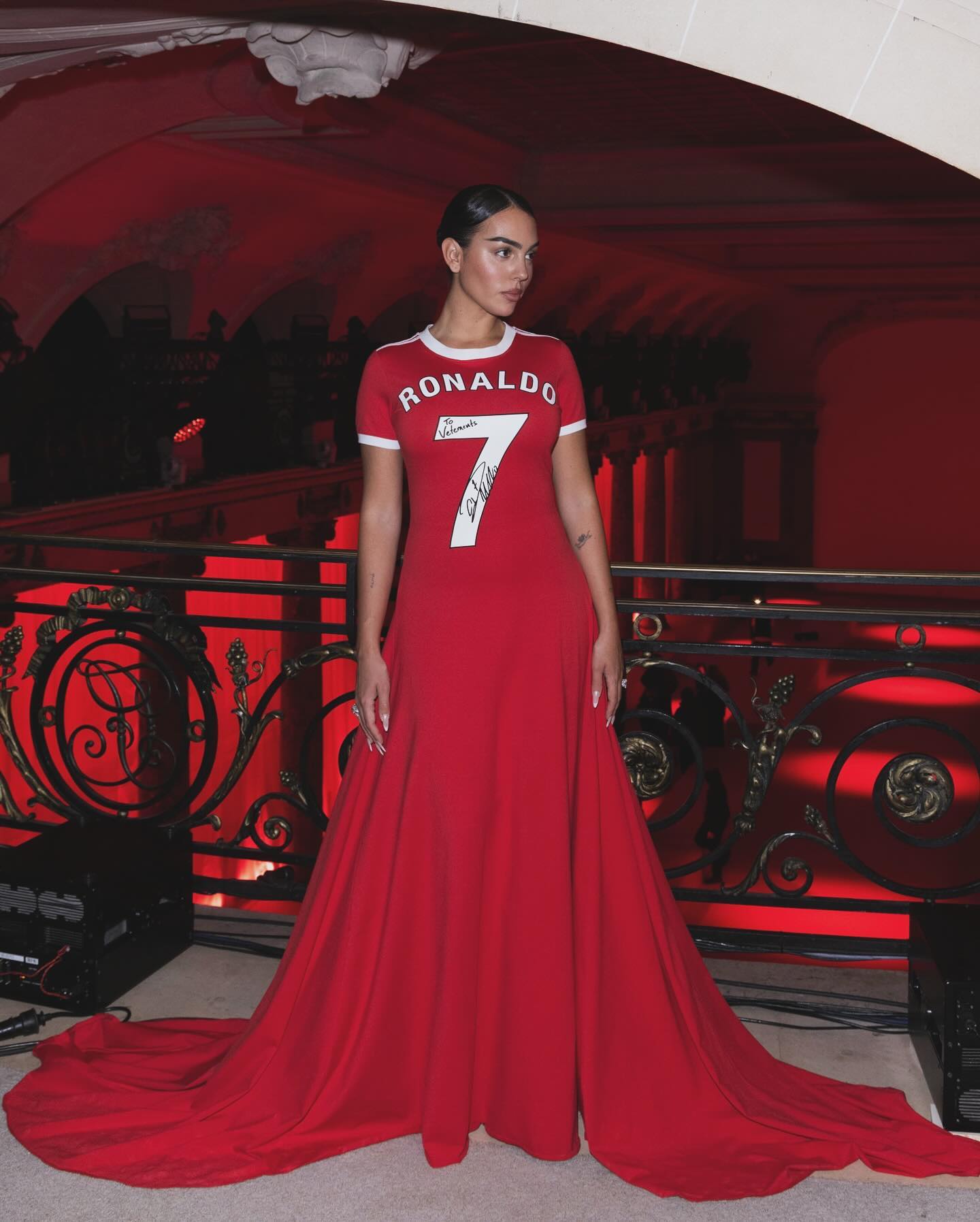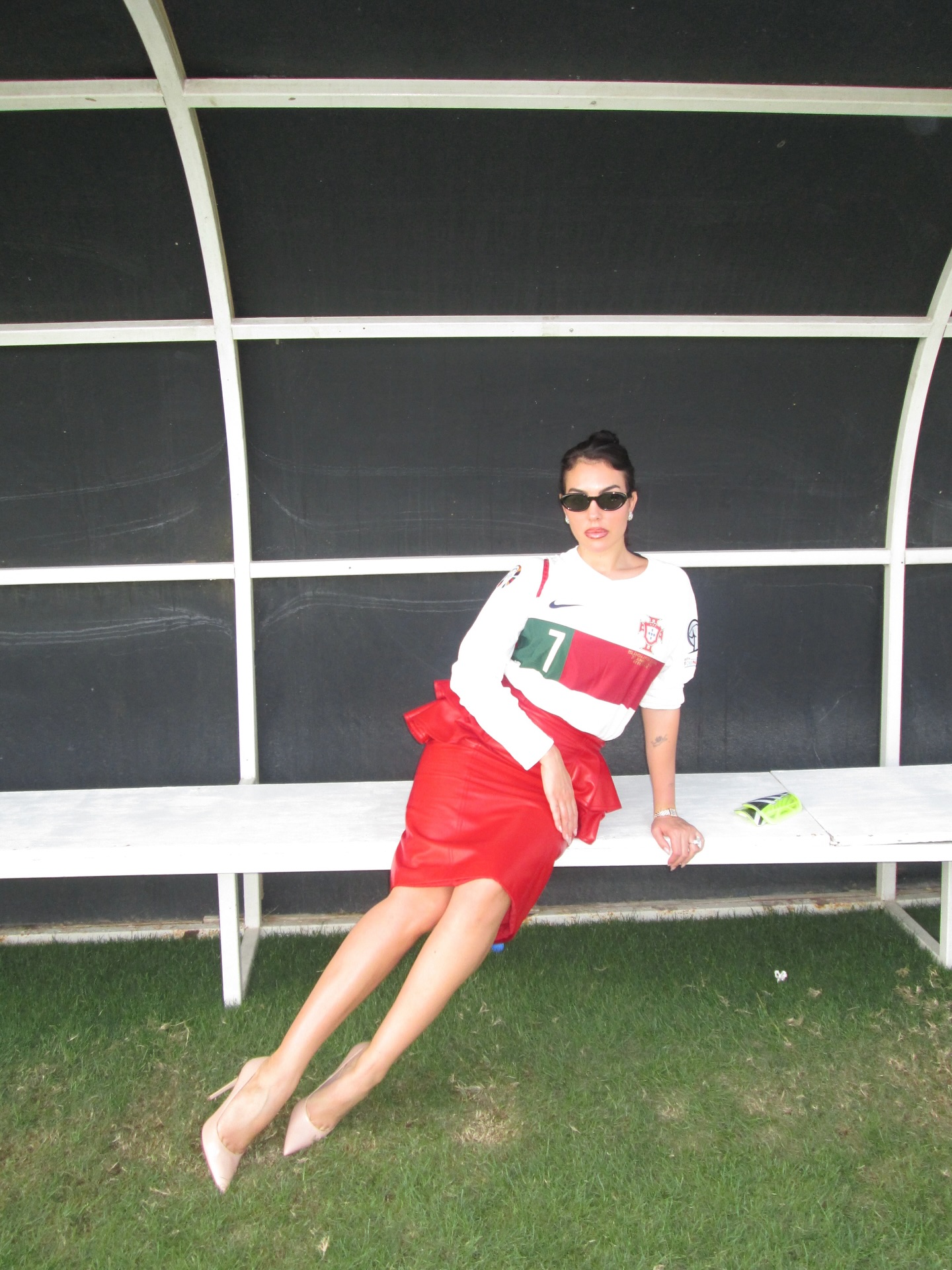 ظهرت جورجينا بإطلالة رياضية أنيقة، قميص المنتخب البرتغالي الأبيض والأحمر برقم 7 واسم رونالدو، مع تنورة جلدية حمراء لامعة ضيقة عند الخصر، وصندل نيود وكلاسات نظارات سوداء، مزيج بين الأناقة وروح التشجيع الرياضي.