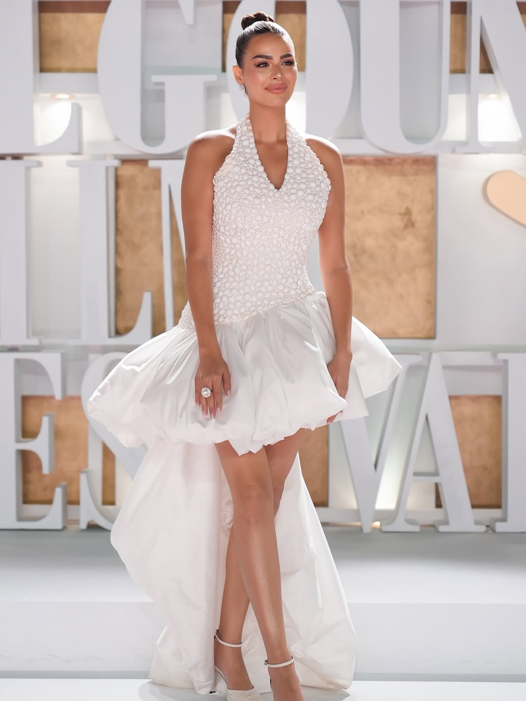 على السجادة الحمراء في مهرجان الجونة السينمائي 2025، أبهرت هنادي الجميع بفستان أبيض قصير تميز بتصميم غير تقليدي؛ إذ جمع بين الدراما والأناقة من خلال أطراف كشكش منفوخة تشكل ذيلًا خلفيًا طويلًا. الجزء العلوي للفستان جاء مطرزًا بالأحجار اللامعة مع ياقة هالتر، بينما اعتمدت تسريحة الكعكة العالية وأقراطًا ماسية تضيف بريقًا متوازنًا. الفستان من توقيع Lima، ونجحت من خلاله في تقديم إطلالة تشع فخامة وأنوثة.