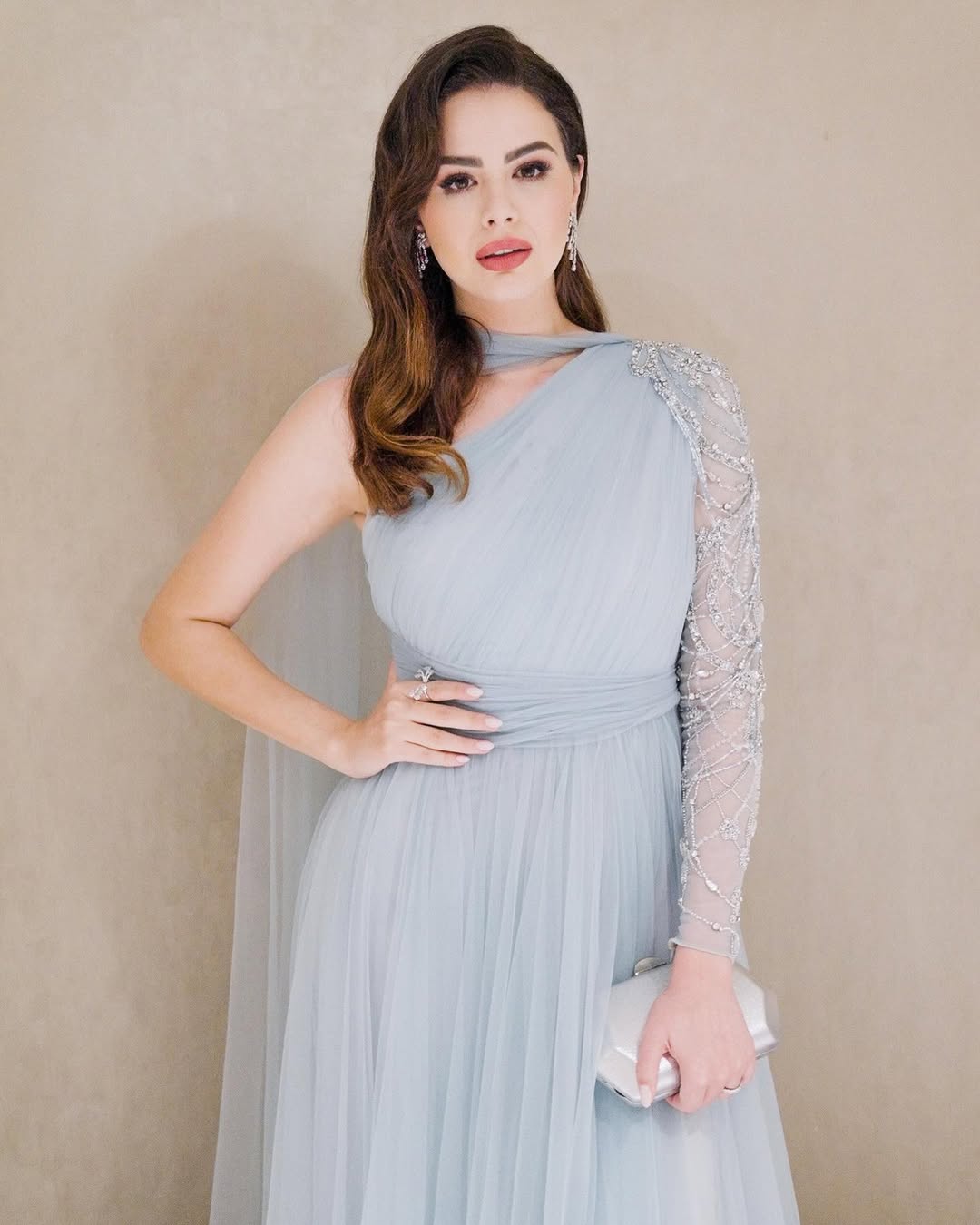 وفي ظهور آخر، خطفت الأنظار بفستان أزرق فاتح من Anass Kadamani، بكتف مكشوف وكم واحد شفاف مزين بتطريزات براقة، مع وشاح طويل ينسدل من الخلف كذيل ملكي. نسقت معه مجوهرات ماسية وتسريحة ويفي أنيقة منحتها مظهرًا ناعمًا كأنها أميرة من الخيال.