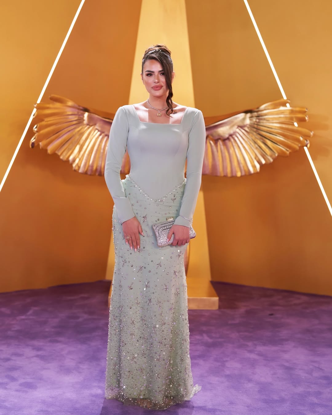 وفي حفل Joy Awards، ظهرت بإطلالة حالمة باللون الأخضر الباستيل، صُممت بقصة مستقيمة وأكمام طويلة وياقة مربعة. الفستان تميّز بطبقة شفافة من التول المرصع بالكريستالات التي عكست الضوء بحركة راقية، وأكملت الإطلالة بمجوهرات فضية وتسريحة الكعكة العالية.