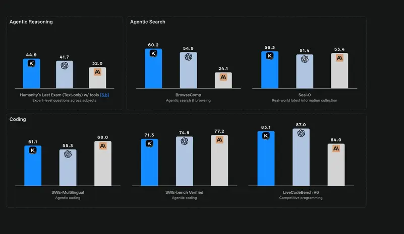 وفقًا للبيانات التي نشرتها شركة Moonshot، حصل نموذج كيمي كيه 2 على نتيجة 44.9% في اختبار Humanity’s Last Exam (HLE)، متفوّقًا على GPT-5 (High) الذي سجل 41.7%، وعلى Claude Sonnet 4.5 Thinking الذي اكتفى بـ 32%.