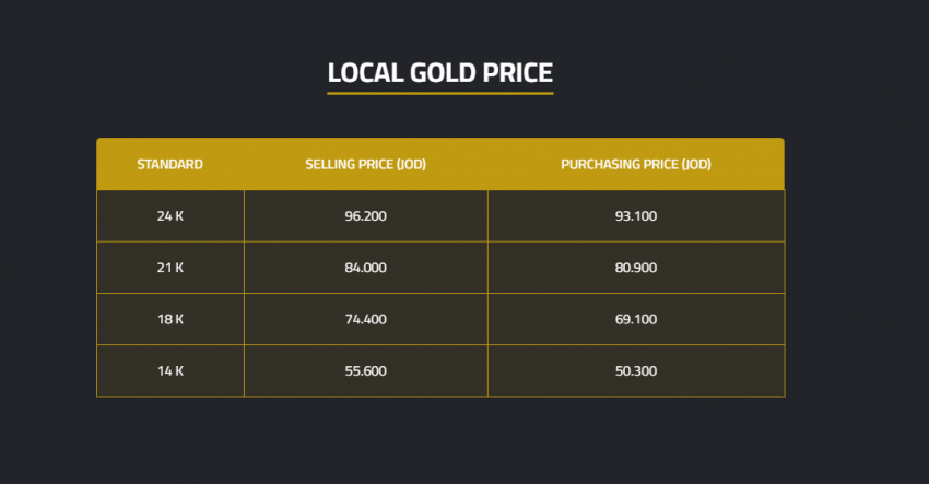 فيما بلغت أسعار الغرام الواحد من الذهب عيارات 24 و18 و14 لغايات البيع من محلات الصاغة عند 96.20 و74.40 و55.60 دينارا على التوالي.