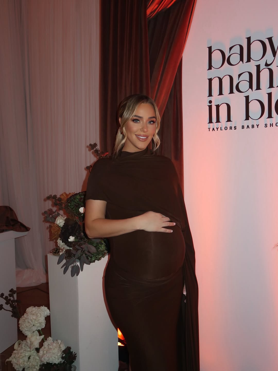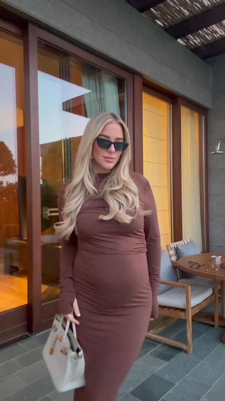 في إحدى الحفلات العائلية احتفالًا باقتراب ولادتها، تألقت بفستان سهرة طويل باللون البني الرائج، بتصميم غير متماثل بكم واحد ووشاح مائل ينسدل حتى الأرض.