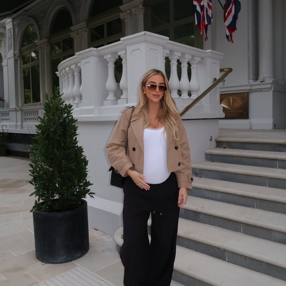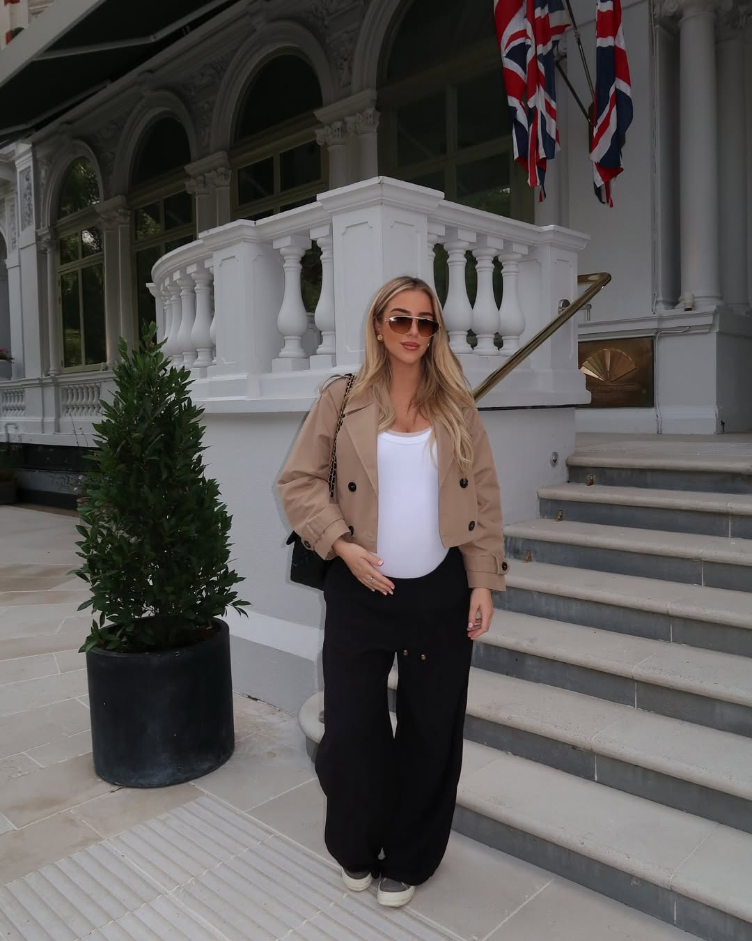 كما تألقت بإطلالة أخرى ببنطال أسود فضفاض وتوب أبيض أبرز بطنها بحيوية، مع جاكيت قصير باللون الكافيه يشبه الترنش، وحقيبة كتف جلدية سوداء وحذاء Converse بنعل سميك، لتبرهن أن المزج بين الكاجوال والأناقة ممكن في كل مراحل الحمل.
