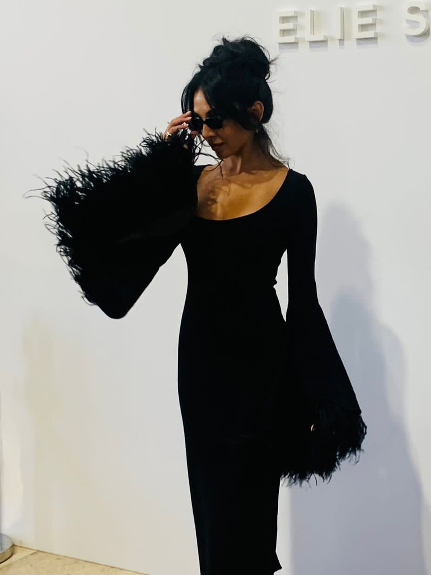 كما أبهرت جمهورها بفستان من توقيع إيلي صعب بتفاصيل الريش على الأكمام الطويلة، منحها مزيجًا من الغموض والدراما الراقية.