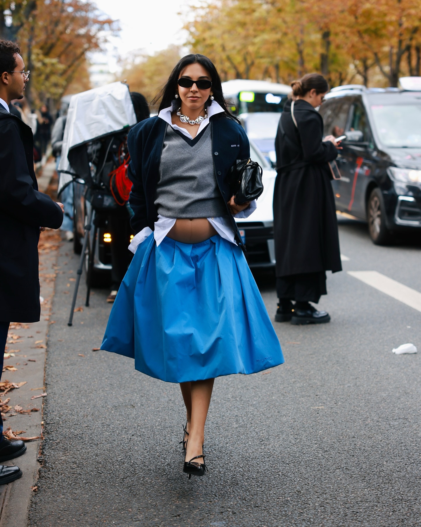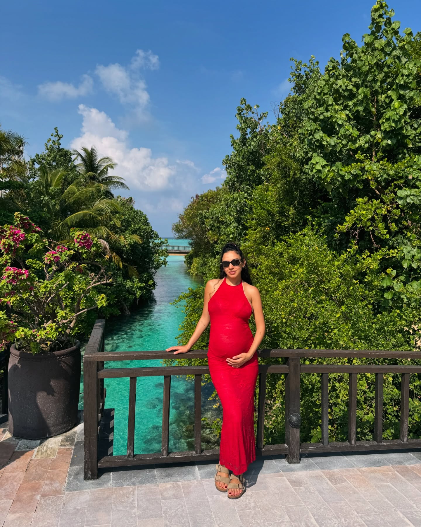 وفي فترة حملها، واصلت سلمى إلهام الشابات بإطلالات عملية وأنيقة، مثل تنورة تركواز وقميص أبيض مع بلوفر رمادي من Miu Miu، أو فستان أحمر بسيط أبرز أنوثتها الطبيعية بأناقة مريحة.