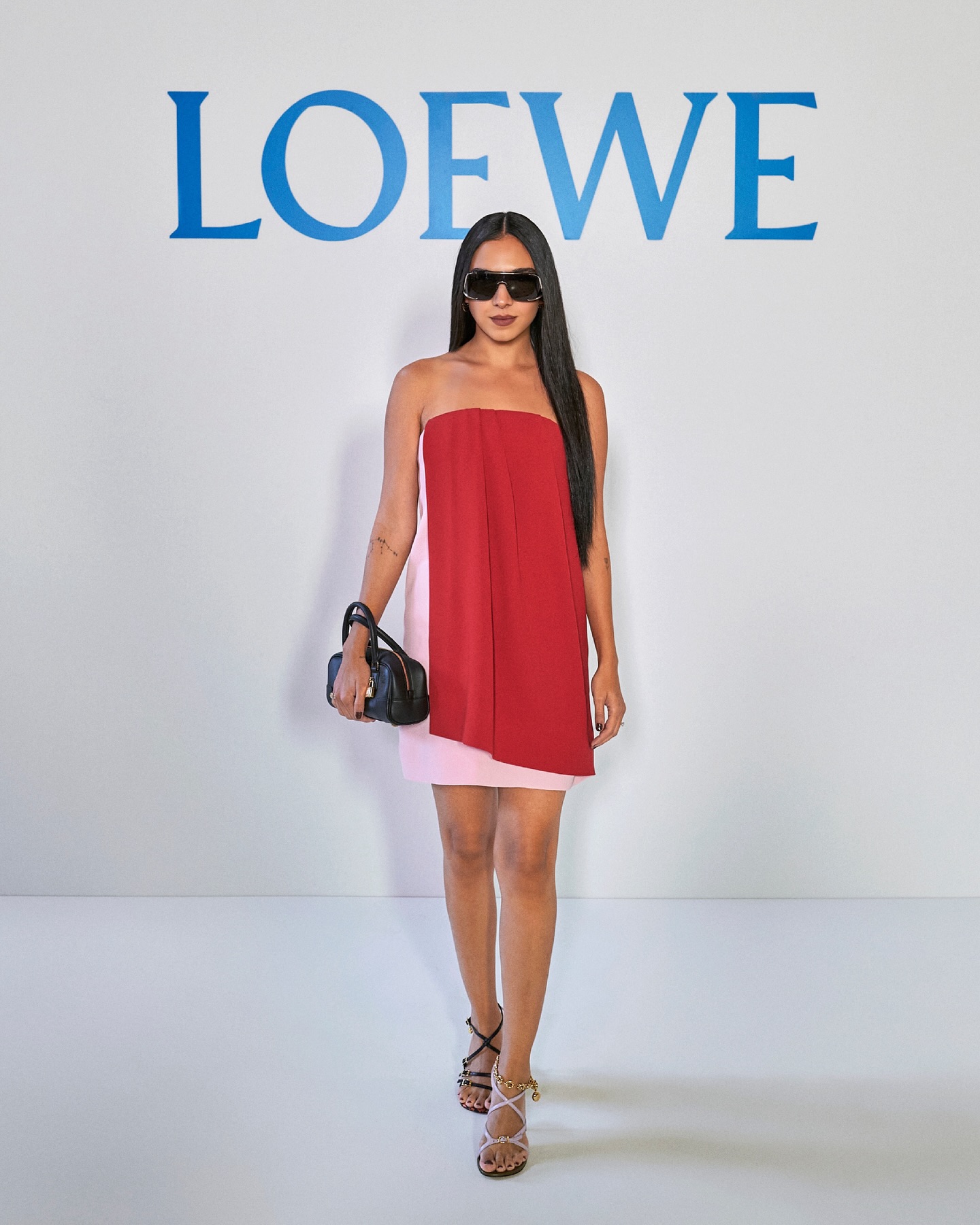 فقد ظهرت بفستان قصير من LOEWE باللونين الوردي الفاتح والأحمر، بتصميم مكشوف الكتفين أبرز أنوثتها، نسّقته مع حقيبة جلدية سوداء صغيرة ونظارات شمسية كبيرة، فجمعت بين الأناقة العصرية والطابع الجريء.