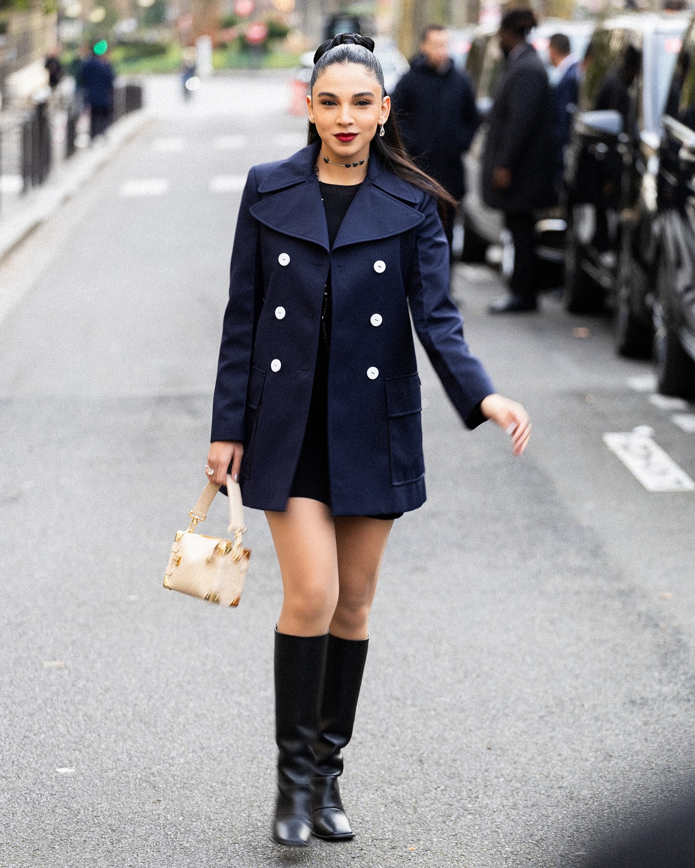 لم تقتصر أناقة سلمى على تصاميم LOEWE، فقد ظهرت أيضًا بإطلالة من Louis Vuitton في أسبوع الموضة بباريس، حيث ارتدت فستانًا قصيرًا أسود نسّقته مع بليزر فضفاض وحذاء بوت جلدي، لتقدّم صورة المرأة العصرية الواثقة.