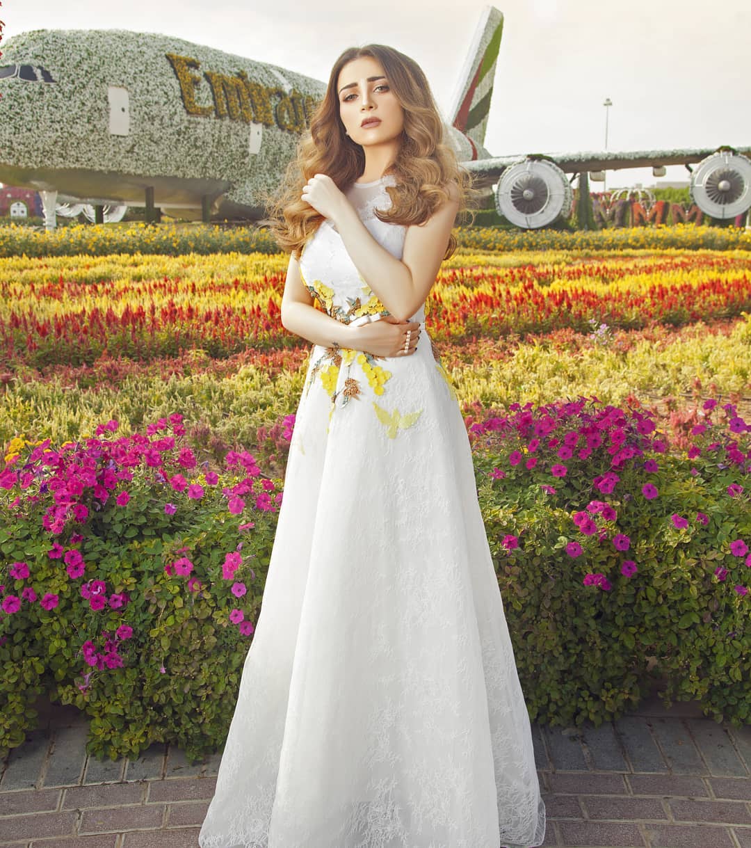 كما ظهرت في جلسة تصوير بفستان من Amato Official واسع القصة، مزدان بتطريزات ورود ملوّنة غلب عليها اللون الأصفر على قماش من الشيفون، مع شعر مموّج ومكياج ترابي أبرز ملامحها الطبيعية.
