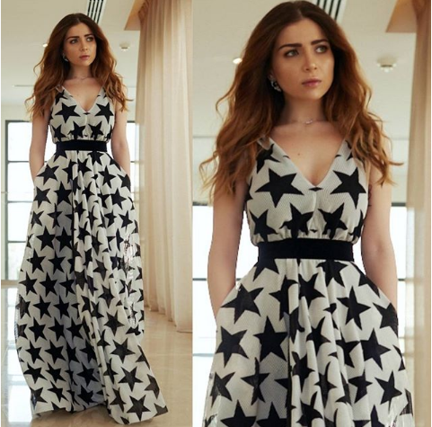 من بين أشهر إطلالاتها أيضاً، تألقها بالفستان الأبيض والأسود من توقيع مرمر حليم، المصنوع من الحرير والمزيّن بطبعة نجوم سوداء لافتة. جاء الفستان بقصّة طويلة وفتحة "V" عند الصدر مع شق جانبي ناعم عند الساق، حافظت مي على احتشامه ببراعة، لتؤكد مرّة جديدة أنها تعرف كيف توازن بين البساطة والرقي في كل ظهور.