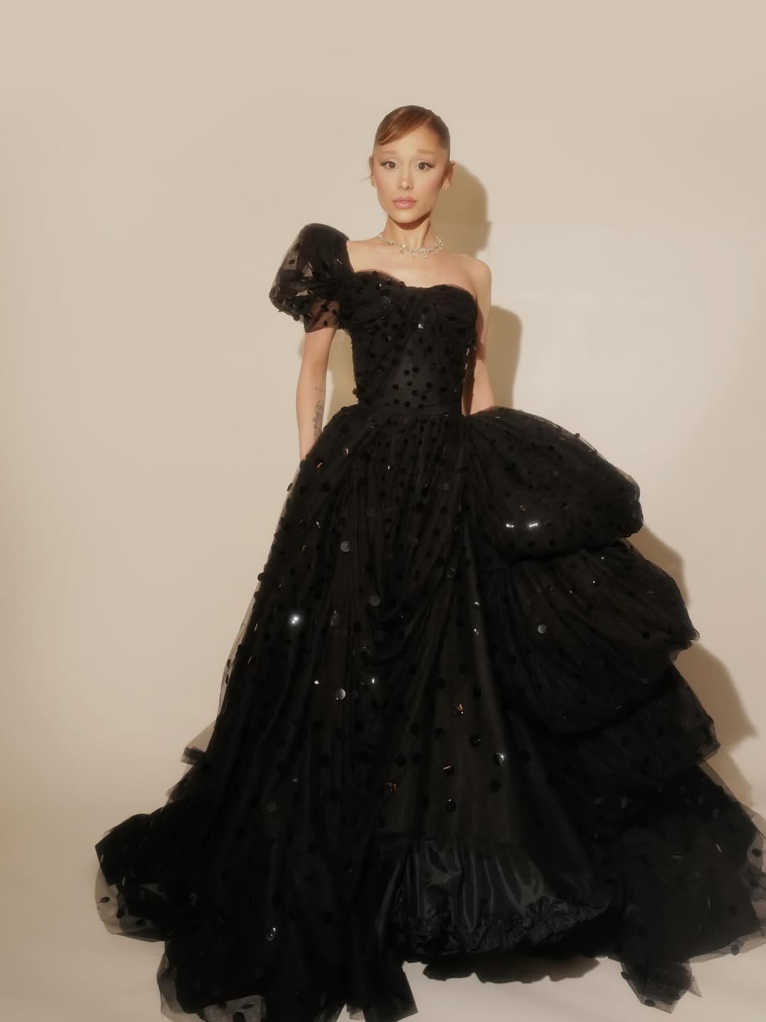 بإشراف منسق الأزياء المعروف لو روتش، ظهرت أريانا بفستان بولكا دوت أسود ساحر يعكس ملامح هوليوود القديمة بكل تفاصيلها. الفستان ذو القصة غير المتماثلة أعاد إلى الأذهان أناقة الخمسينات، فيما أضفت المجوهرات الماسية من Swarovski بريقًا يليق بنجمة تعرف تمامًا كيف تمزج بين الأصالة والعصرية.