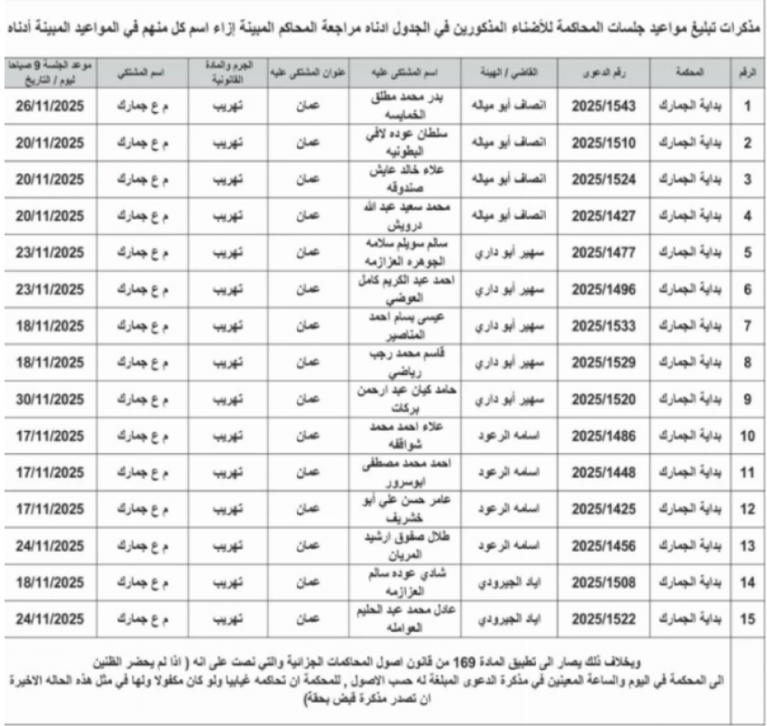للعلّم - صدرت اليوم الاثنين مذكرات تبليغ مواعيد جلسات المحاكمة لمشتكى عليهم ولمتهمين ولأظناء وقرارات إمهال.