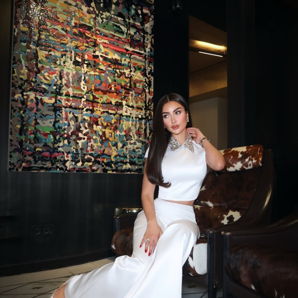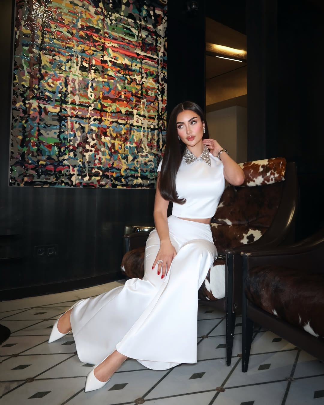 وقدّمت الأبيض أيضًا بشكل عصري أنعم عبر طقم حريري مكون من بنطال واسع وكروب توب بياقة مرصعة بالأحجار، مكتفية بمجوهرات بسيطة وشعر مالس هادئ.