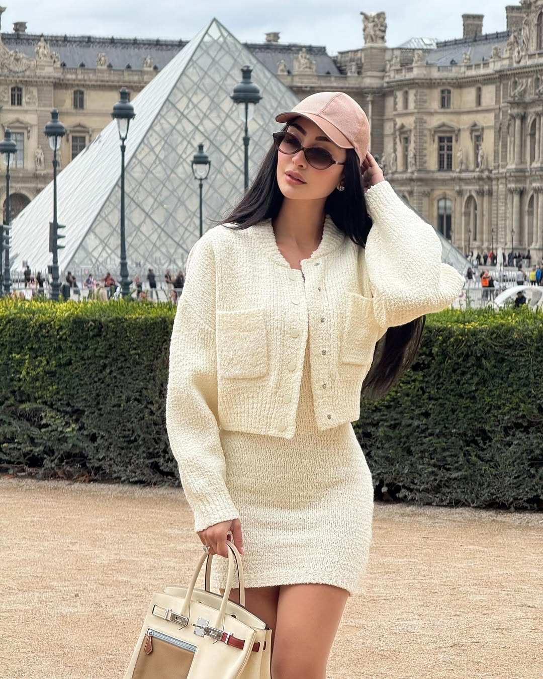 اعتمدت طقمًا صوفيًا بيج من فستان ميني مجسم وقميص صوفي طويل بالجيوب، نسقته مع حذاء رياضي وحقيبة هيرمس وقبعة بيسبول بنية، مما جعل الطلة عملية وناعمة في الوقت نفسه.