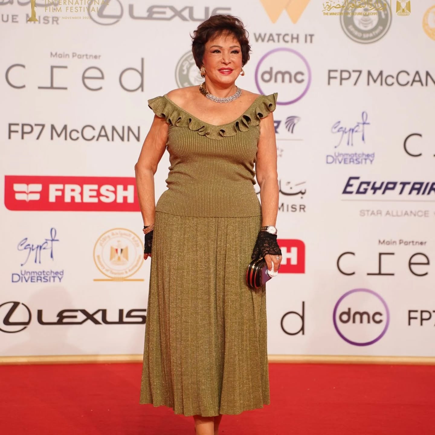 لبلبة تألقت بفستان زيتي مائل للذهبي بقصة متوسطة الطول وكتفين مكشوفين مع كشكش ناعم حول الياقة. القفازات الدانتيل أعطت الإطلالة نكهة كلاسيكية أنيقة، فيما أضافت الحقيبة المعدنية وعقد براق لمسات فخمة محكمة.