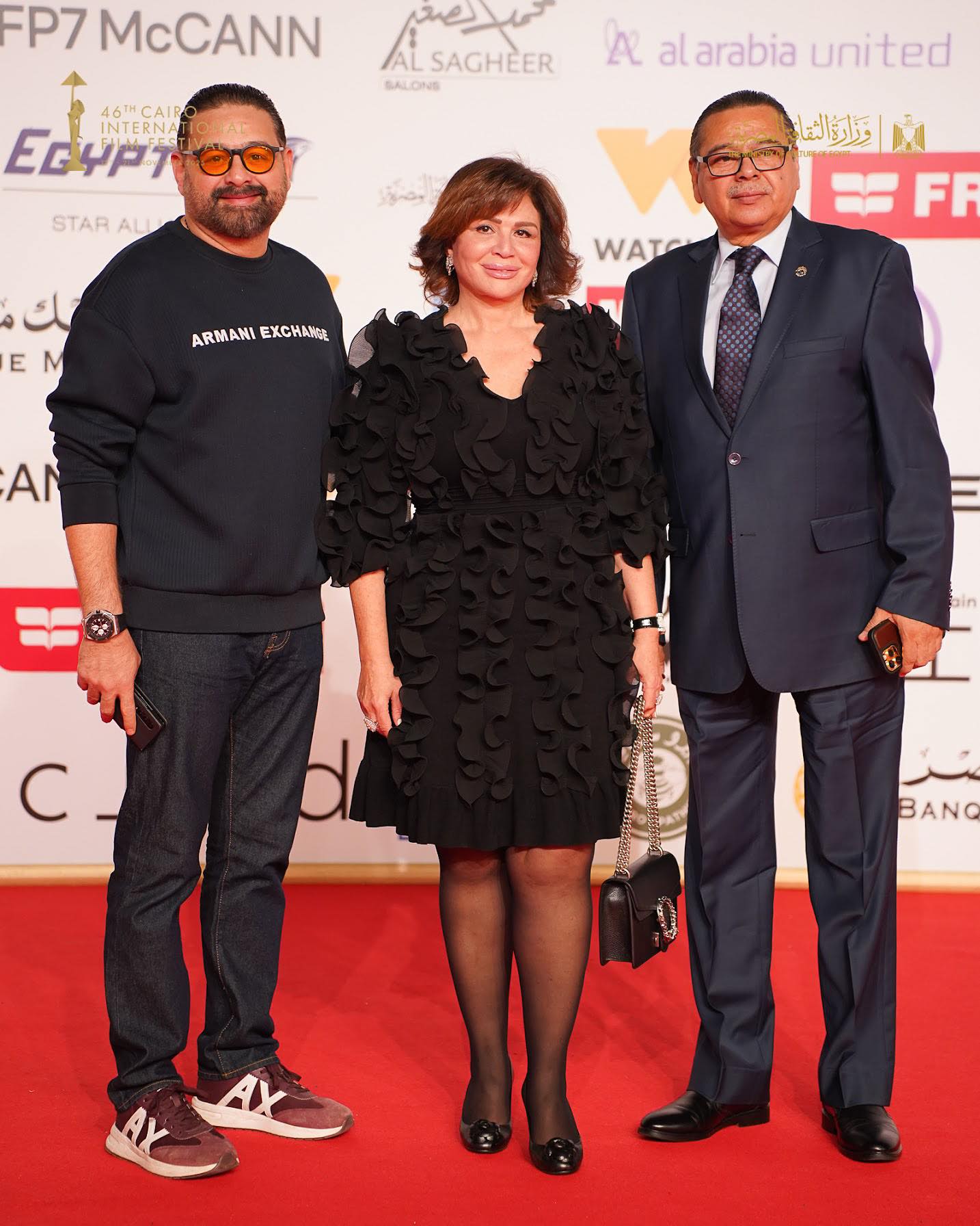إلهام شاهين اختارت فستانًا أسود قصيرًا مُطرزًا برسوم أوراق متكررة تمنحه عمقًا بصريًا دون صخب. الأكمام المنتفخة قليلًا أعطت لمسة مرحة رصينة، بينما اكتملت الإطلالة بحقيبة فضية وحذاء أسود لامع لمزيد من الاتزان.