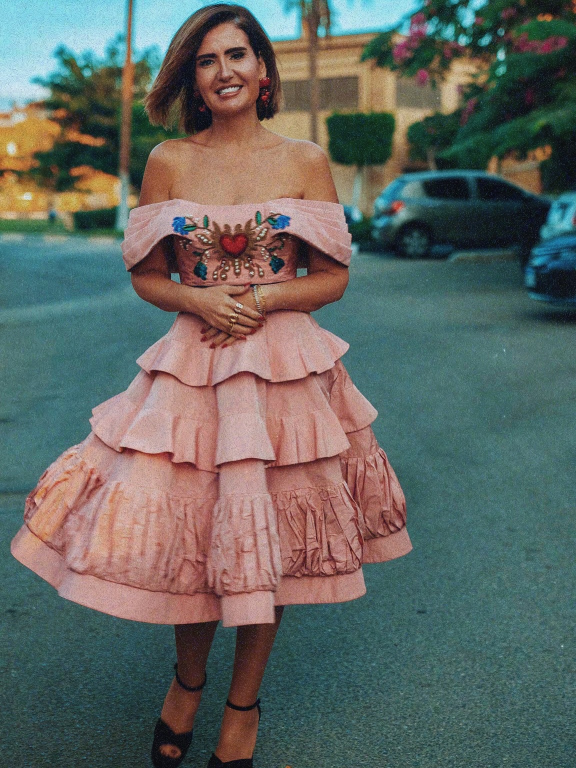 قدمت هنا شيحة إطلالة مرحة ومبهرة من Bazaza، بفستان وردي بكتف مكشوف وتطريزات فنية دقيقة على الصدر على شكل قلب تتخلله تفاصيل نباتية. التصميم يتدرج بطبقات كشكش واسعة تمنح الفستان حركة وحيوية لافتة. أكملت الإطلالة بحذاء أسود بكعب عالٍ منح حضورًا أنثويًا جريئًا دون مبالغة.