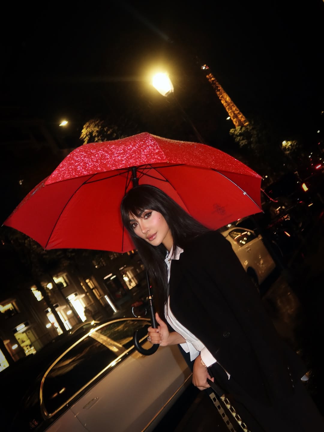 زخرفة الفستان بالقلب المدبب والزمزمات العمودية أظهرته مثاليًا لسهرة ماطرة، وقد نسقته مع حقيبة صغيرة بقفل كريستالي وحذاء مدبب، فيما حافظت المظلة السوداء على الشعر المتموج من البلل—دليل أن الأناقة ممكنة حتى تحت الأمطار.