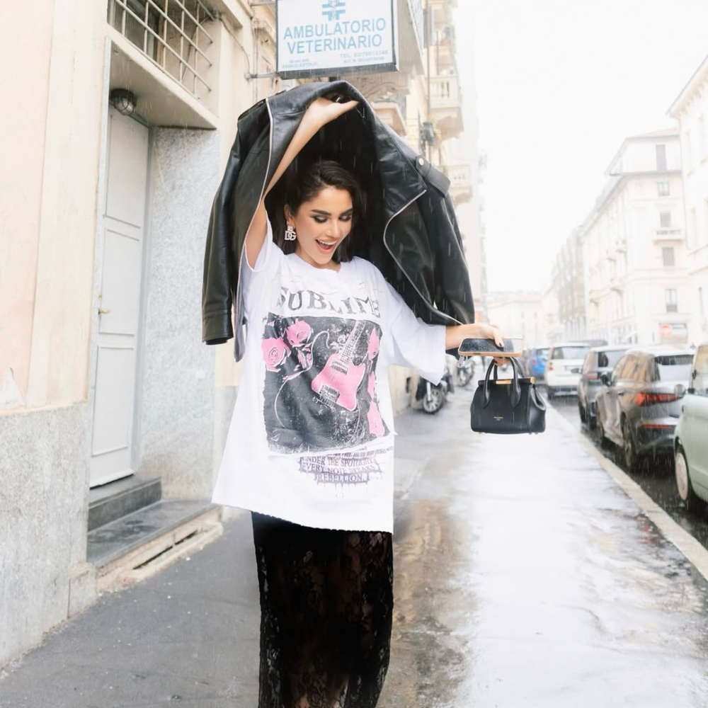تنورة دانتيل سوداء بطول ميدي مع تيشيرت أبيض مطبوع بلمسة موسيقية وصندل أسود بسيط. حملت جاكيت جلد كبير استخدمته بواقعية لحماية شعرها من المطر، فيما نسقت الإطلالة بأقراط تحمل شعار الدار لتبقى تفاصيلها موحدة ومتناسقة.