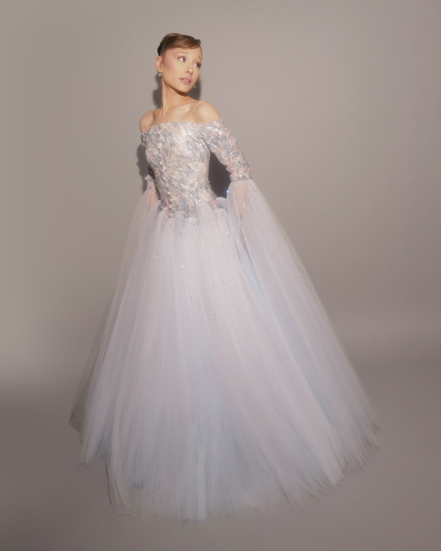 كما اختارت فستانًا أزرق ثلجي من Thom Browne بأسلوب أميري واسع وتدرجات شفافة، يعكس حضورًا حالميًا يشبه الأميرات، مع تطريزات فضية دقيقة تضيف بريقًا رقيقًا.