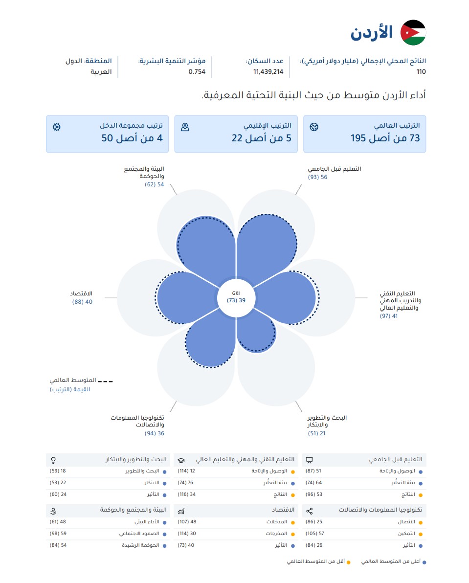 ويعكس هذا التقدم التزام الأردن الراسخ بتطوير منظومة المعرفة في الأردن، وتعزيز تنافسيته في المؤشرات الدولية ضمن جهود تحقيق أهداف ومستهدفات رؤية التحديث الاقتصادي الهادفة لتعزيز الاقتصاد المعرفي الأردني القائم على الإبداع والتكنولوجيا.