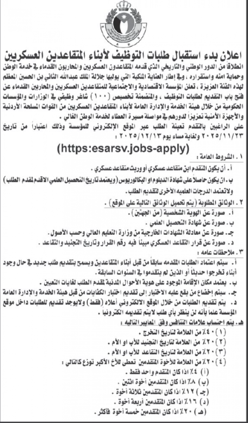 للعلّم - أعلنت المؤسسة الاقتصادية والاجتماعية للمتقاعدين العسكريين والمحاربين القدماء عن فتح باب التقديم لطلبات التوظيف، والمتضمن تخصيص (100) شاغر وظيفي في الوزارات والمؤسسات الحكومية من خلال هيئة الخدمة والإدارة العامة، وذلك لأبناء المتقاعدين العسكريين من القوات المسلحة الأردنية والأجهزة الأمنية، تعزيزًا لدورهم في مواصلة مسيرة العطاء وخدمة الوطن الغالي.