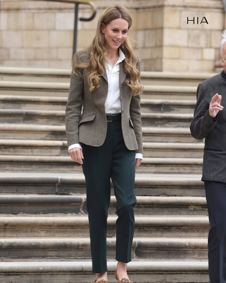كما أطلت سابقًا ببدلات رسمية عملية نسقتها مع بناطيل كاحل كلاسيكية وجاكيتات بتدرجات البني، مع أحذية مسطحة… بيان جديد يؤكد أن الأناقة لدى كيت ليست مجرد فستان سهرة، بل فلسفة أسلوب تعيش يوميًا.