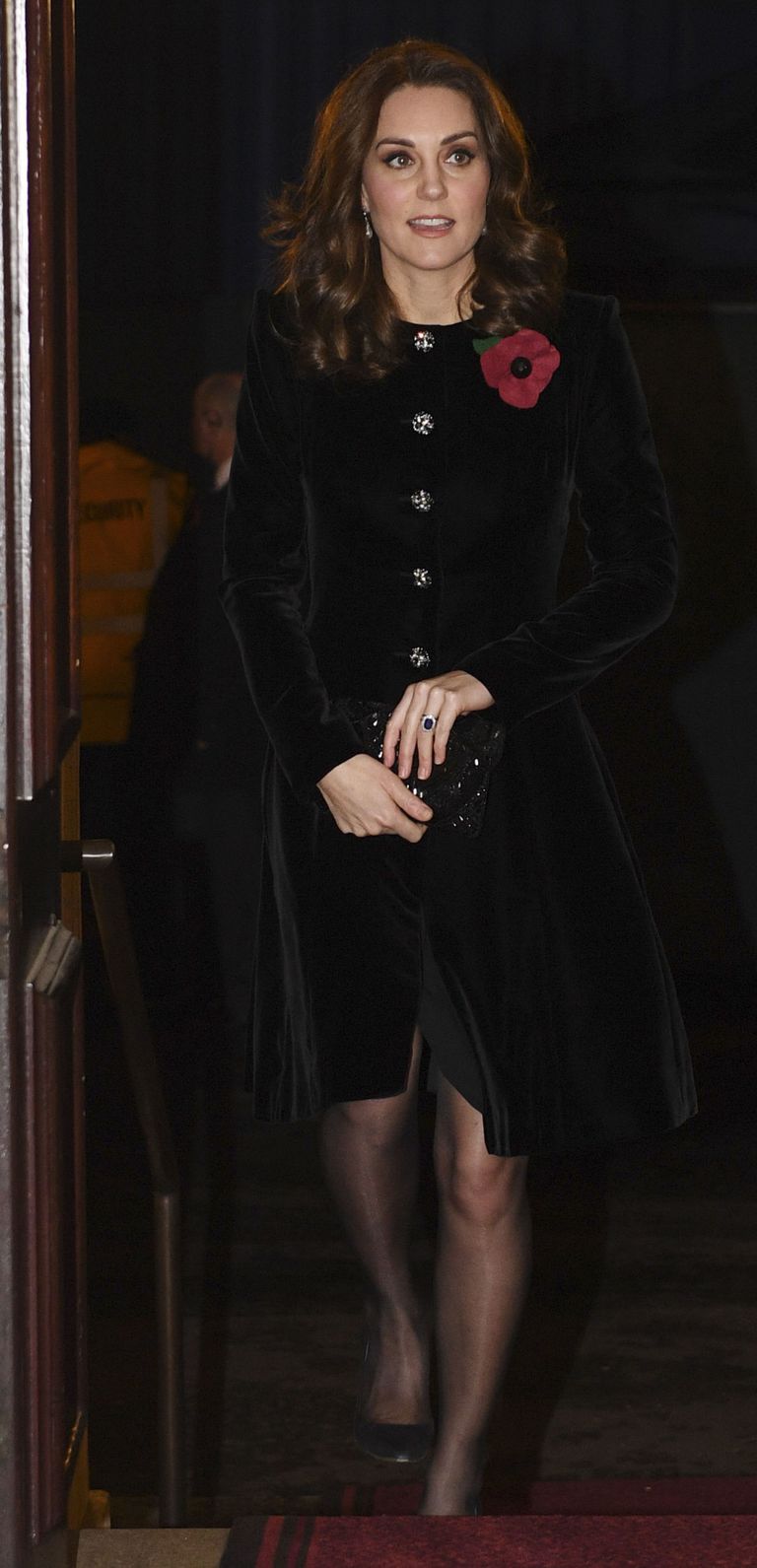 ولأن المعطف المخملي يملك جاذبية يصعب مقاومتها، اختارته كيت بقصة متوازنة حتى الركبتين وأزرار براقة. حقيبة كلاتش صغيرة مع حذاء أسود وكعادتها دبوس الخشخاش الأحمر أضف لمسة رمزية أنيقة تحترم المناسبة بدون تعالي.