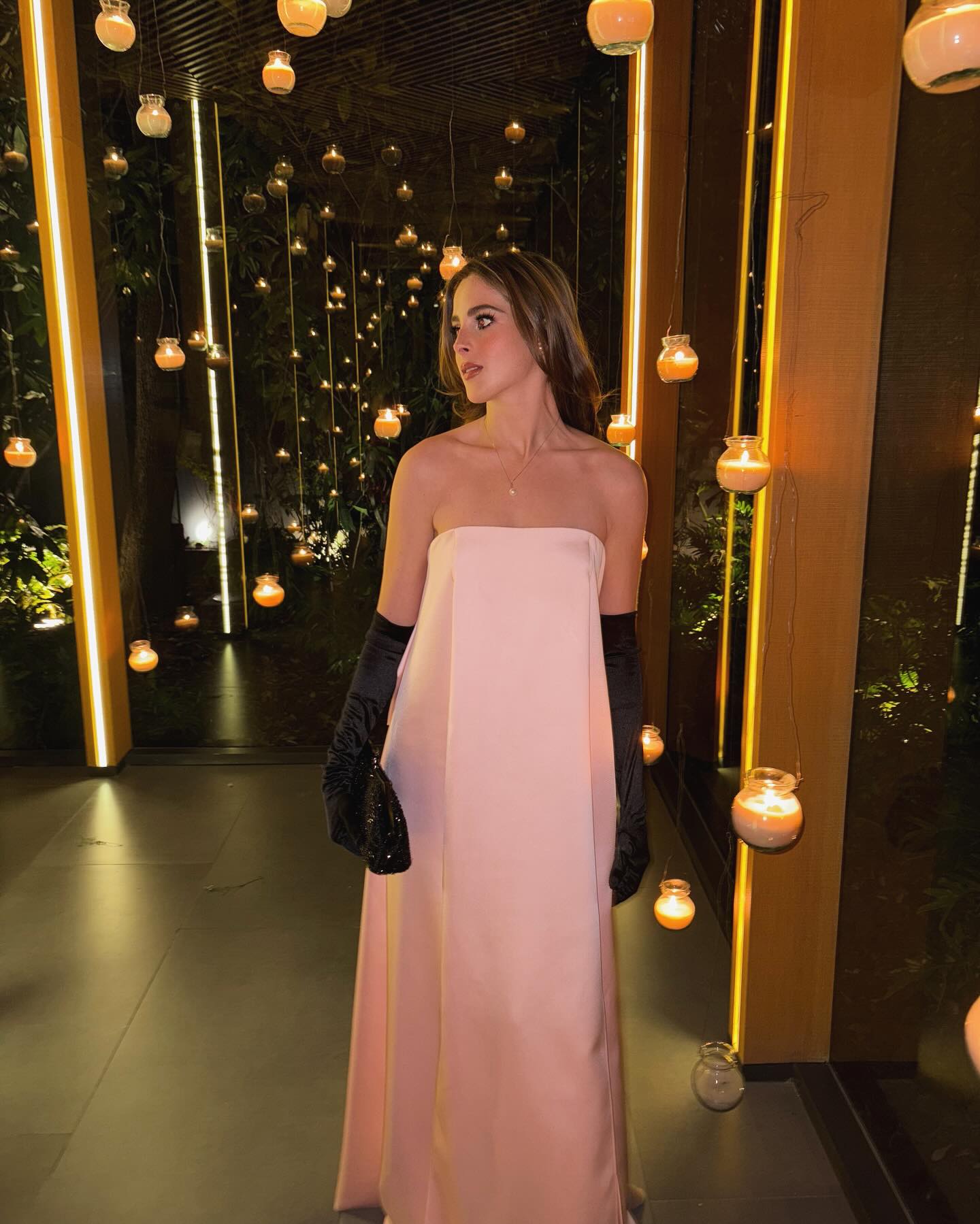 في إحدى أجمل إطلالاتها، تألقت فاطمة بفستان سهرة طويل من توقيع Trino Orozco بتدرجات البيج الذهبي المائل إلى الوردي، منسدل بانسيابية أنثوية.