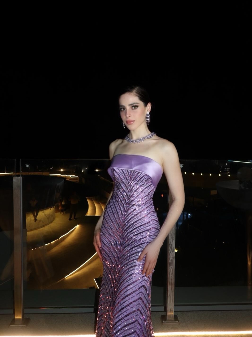 وفي ظهور آخر من توقيع المصمم نفسه، اختارت فاطمة فستاناً طويلاً بلون بنفسجي هادئ، صُمم من قماش لامع بخيوط ترتر هندسية دقيقة.