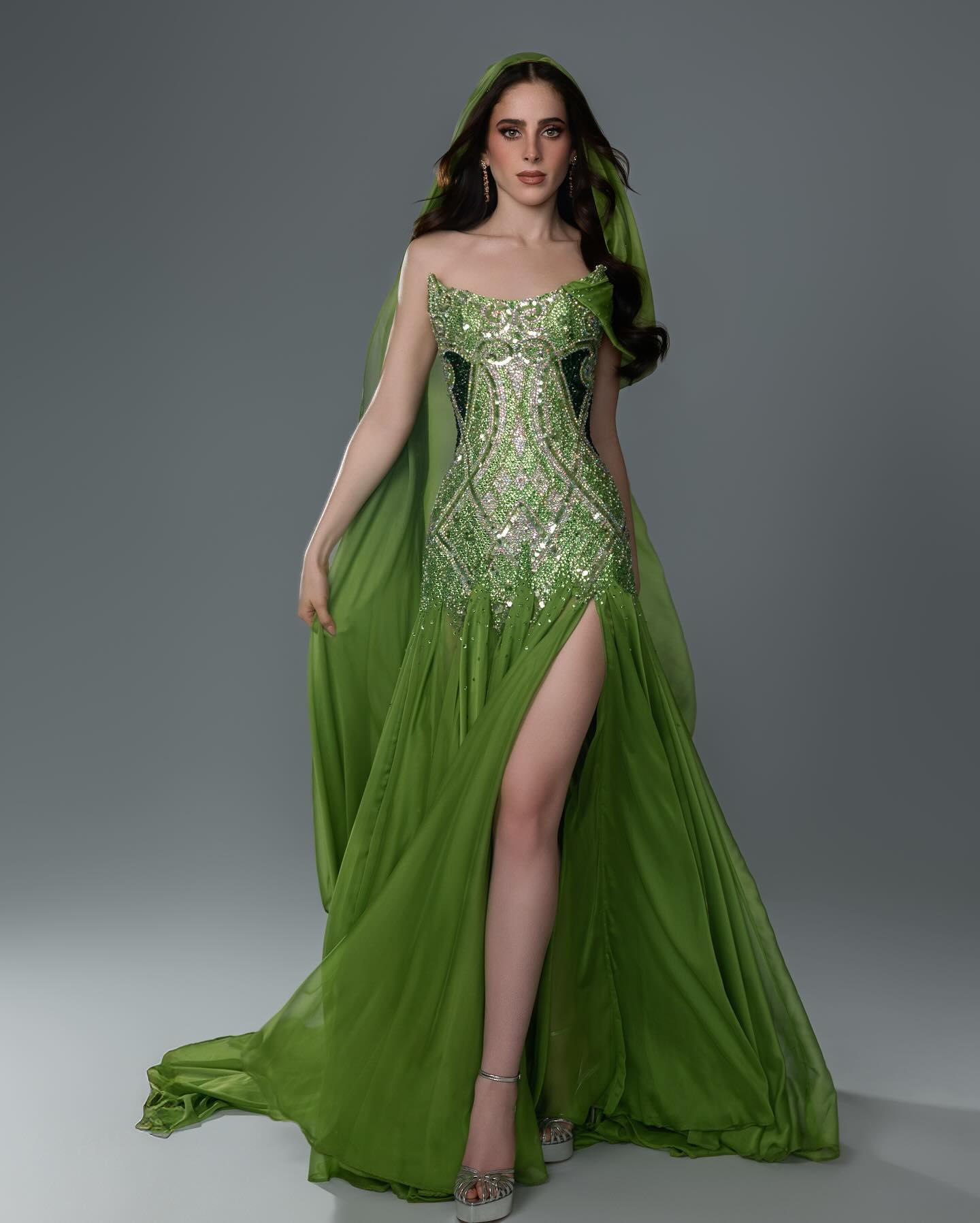 اختارت ملكة جمال الكون فستاناً أخضر زمردياً مطرّزاً بالكريستال والخرز الفضي، بقصة ضيقة عند الصدر والخصر مع تنورة شفافة واسعة ذات فتحة جانبية.
