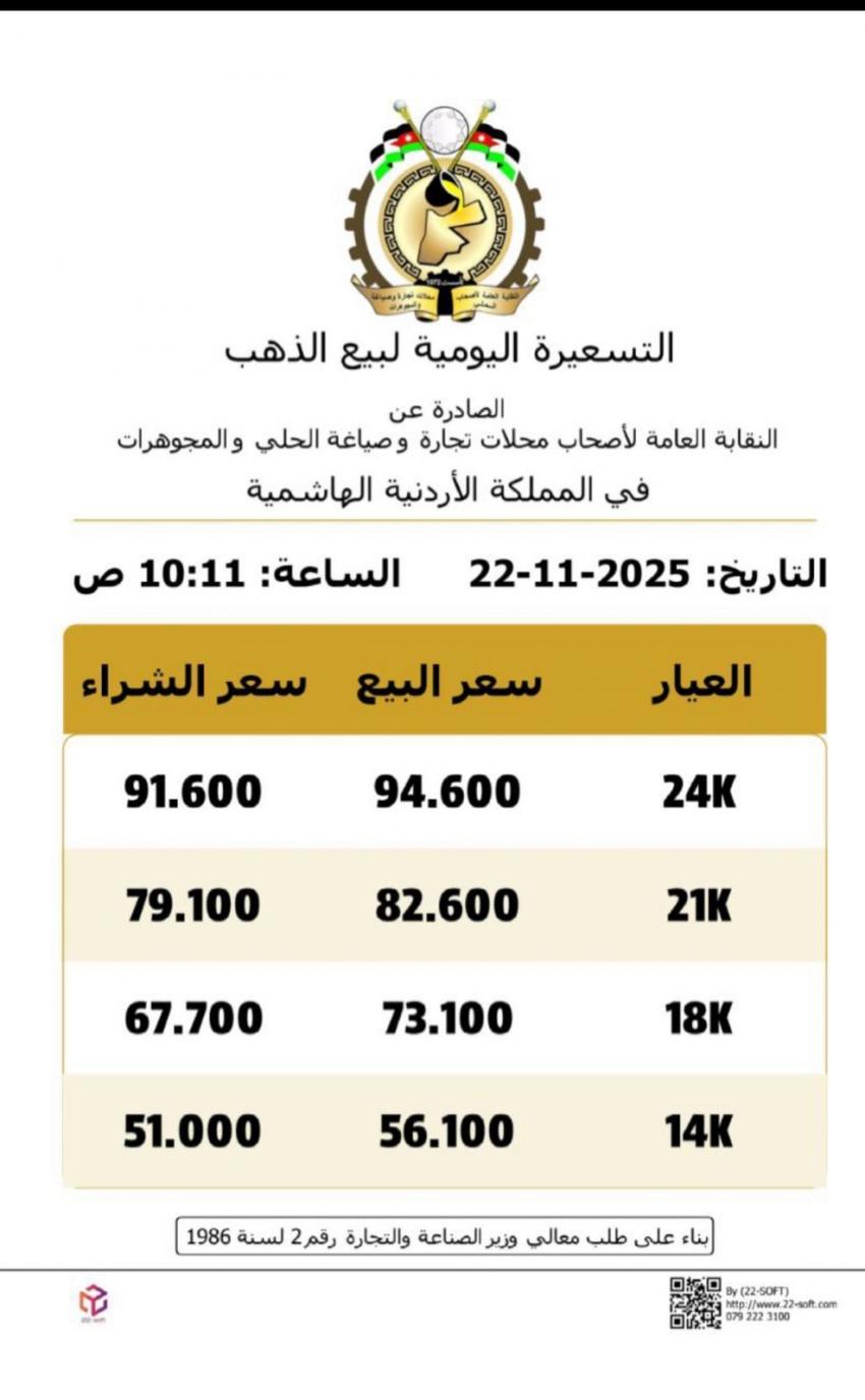 أما أسعار بيع الذهب للعيارات الأخرى، فقد سجل سعر غرام عيار (24) في محال الصاغة 94.6 دينارا، في حين بلغ سعر بيع غرام الذهب من عيار (18) 73.10 دينارا، وعيار (14) بلغ سعره 56.10 دينارا.