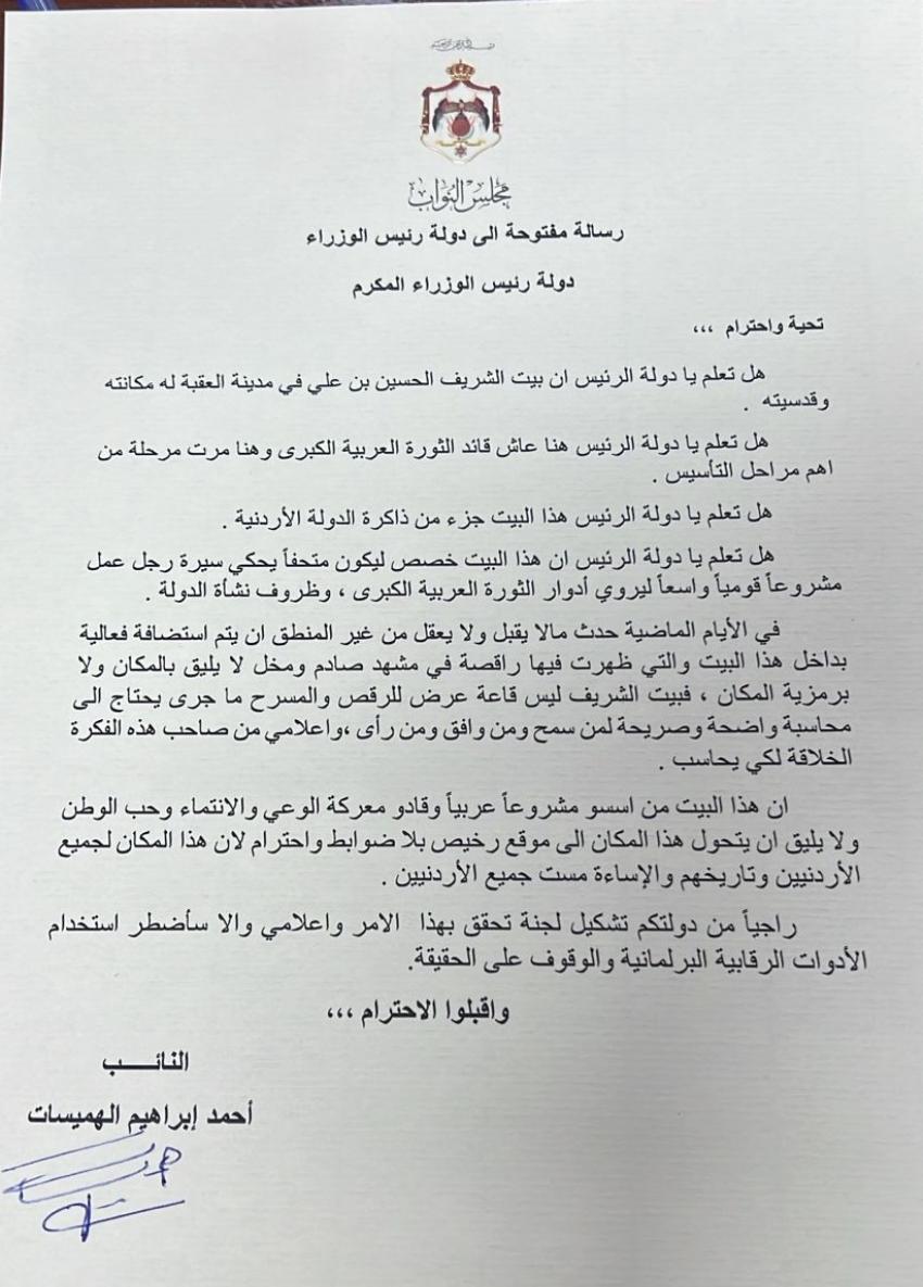 النائب أحمد الهميسات وجه رسالة مفتوحة إلى رئيس الوزراء، عبّر فيها عن الاستهجان الشديد لإقامة الحفل داخل بيت الشريف الحسين بن علي في مدينة العقبة، واصفه بأنه فعالية مخالِفة لطبيعة المكان ورمزيته التاريخية والوطنية.